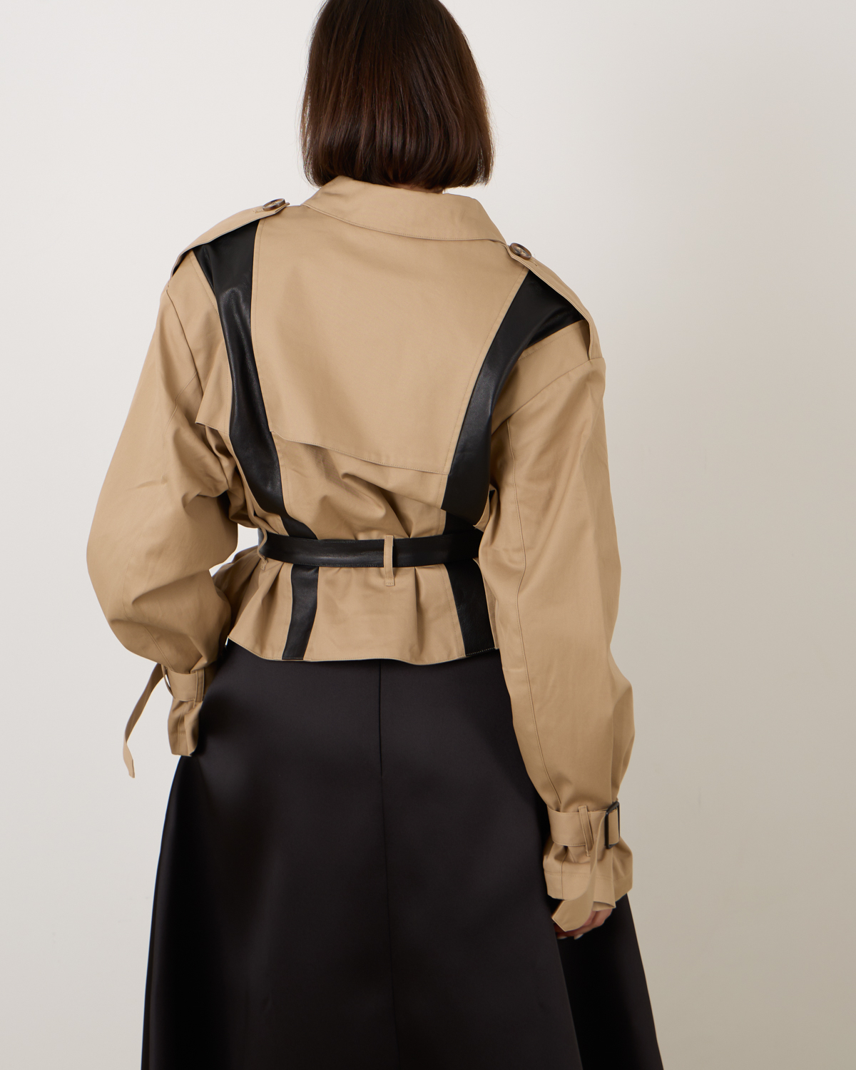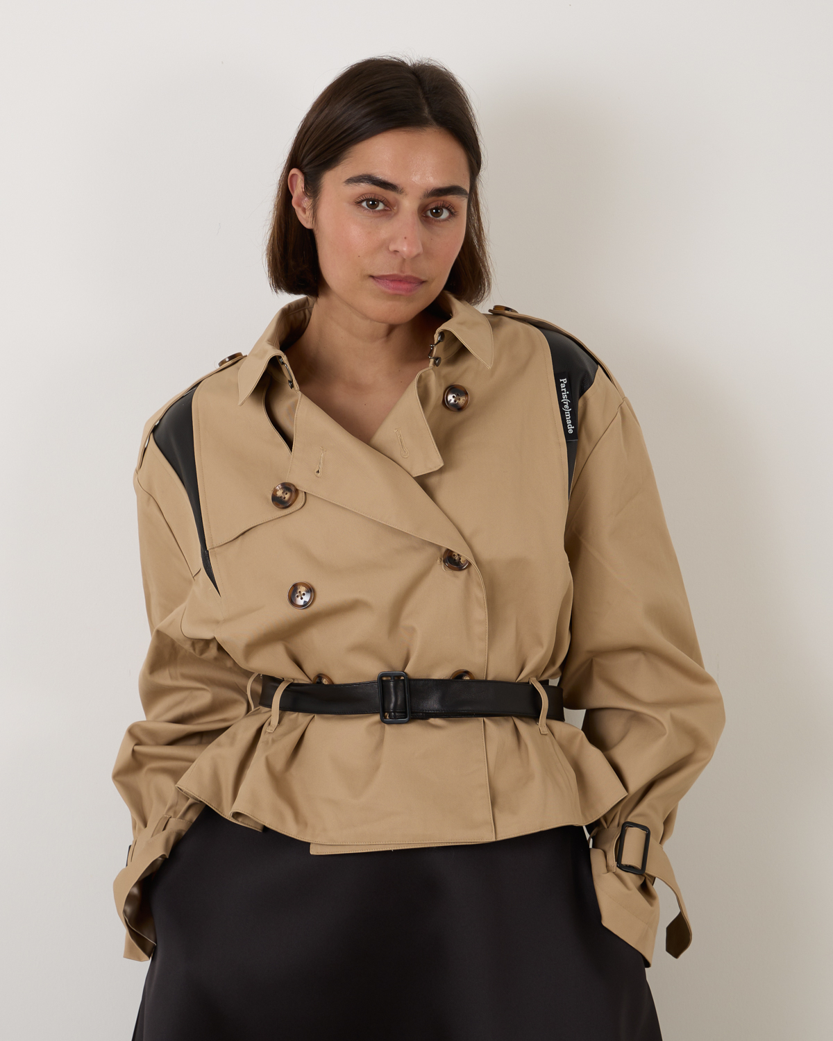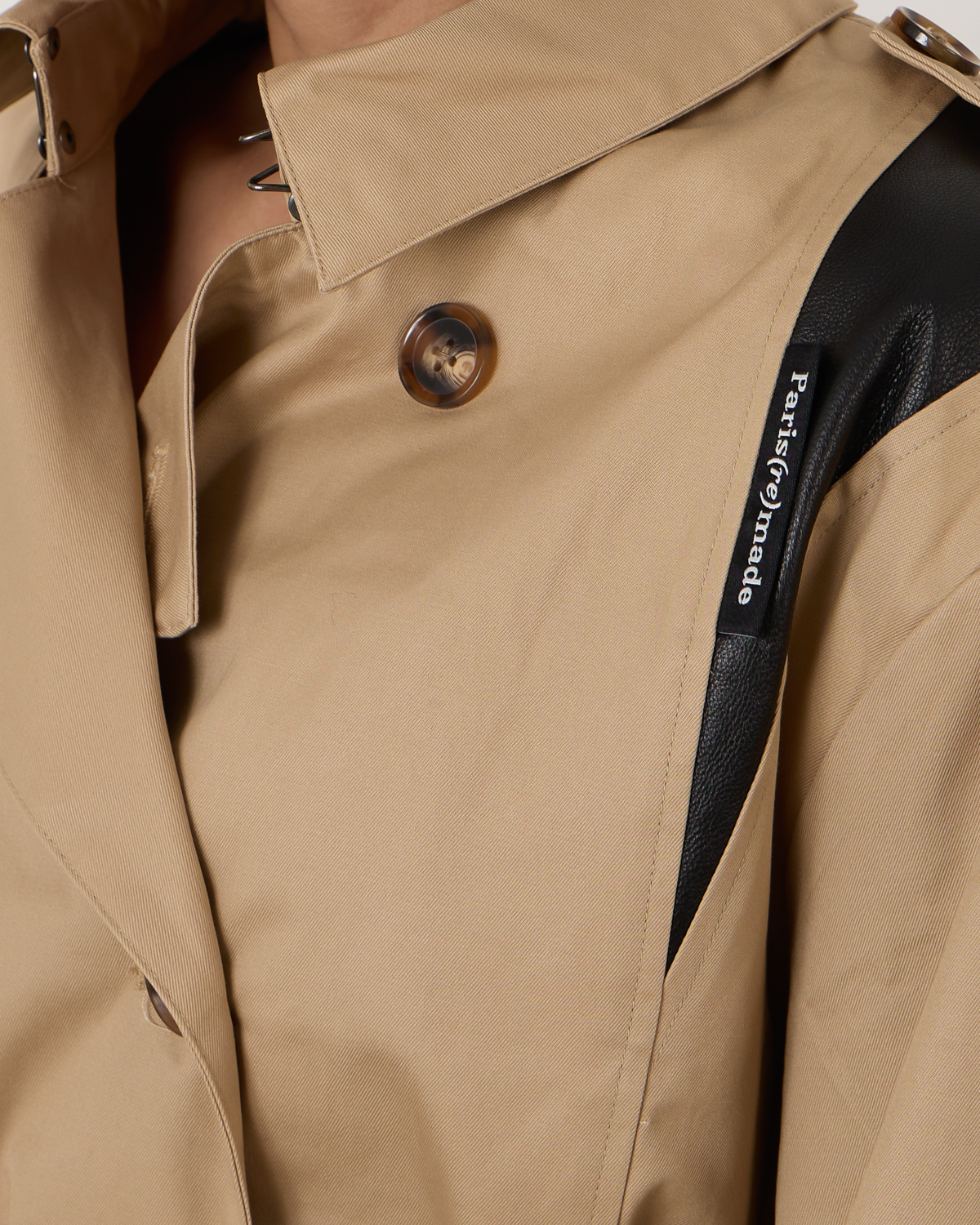Dit jack van 1/OFF is remade - het kenmerkt zich door een klassiek trench-stijl, voorzien van stoere elementen. Het jack is oversized en komt samen met een taille ceintuur en gespen rond de polsen. Het is aan de voorzijde voorzien van een double-breasted knoopsluiting en lederen inzetstukken voor een stoere touch.