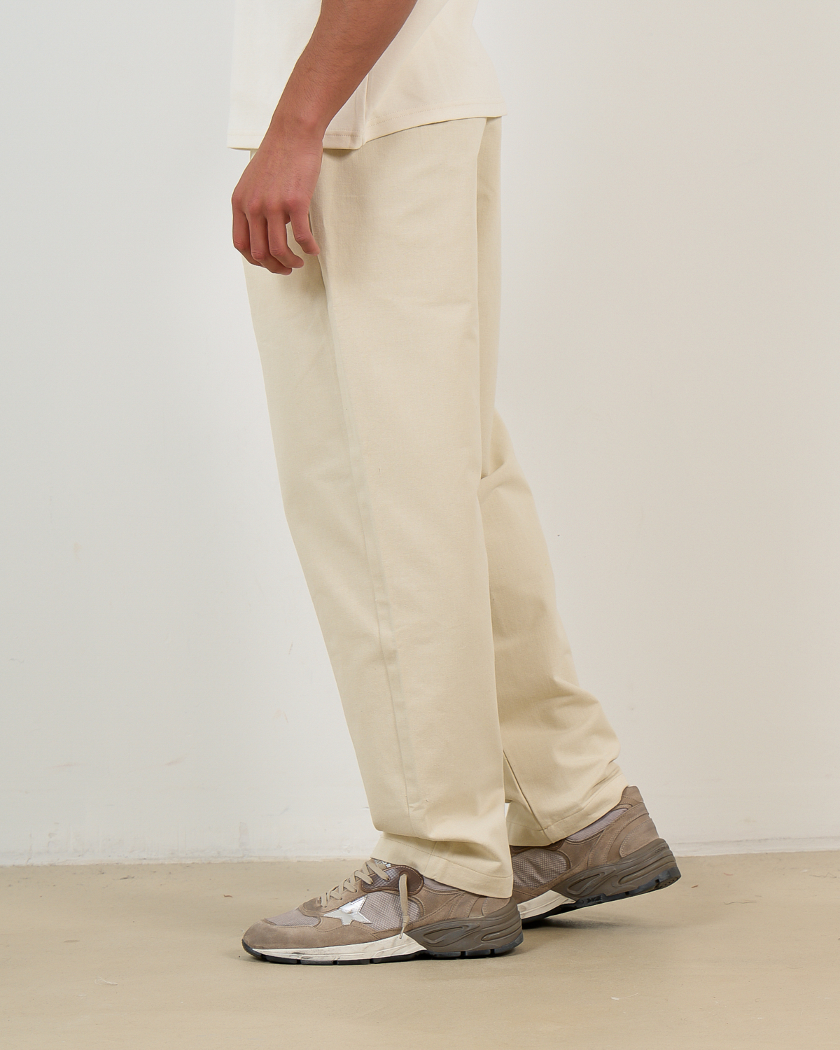 Combineer deze ecru pantalon met een witte katoenen blouse voor een klassieke look, of draag hem casual met een gebreide trui en sneakers voor een eigentijdse twist.