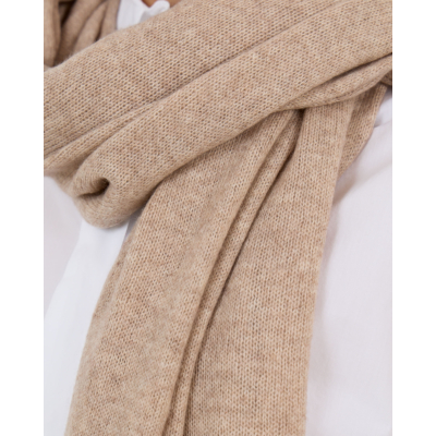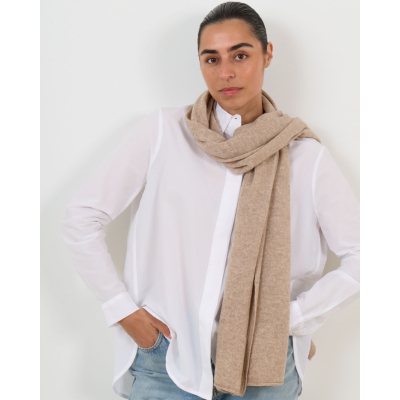 Deze luxueuze sjaal in zandkleur valt op door zijn verfijnde structuur en zachte cashmere kwaliteit. Het 100% cashmere materiaal voelt heerlijk aan en biedt optimaal draagcomfort. De rechthoekige vorm en fijne brei maken deze sjaal veelzijdig te dragen. Je kunt de sjaal losjes om je nek draperen of elegant om je schouders leggen.