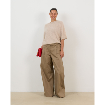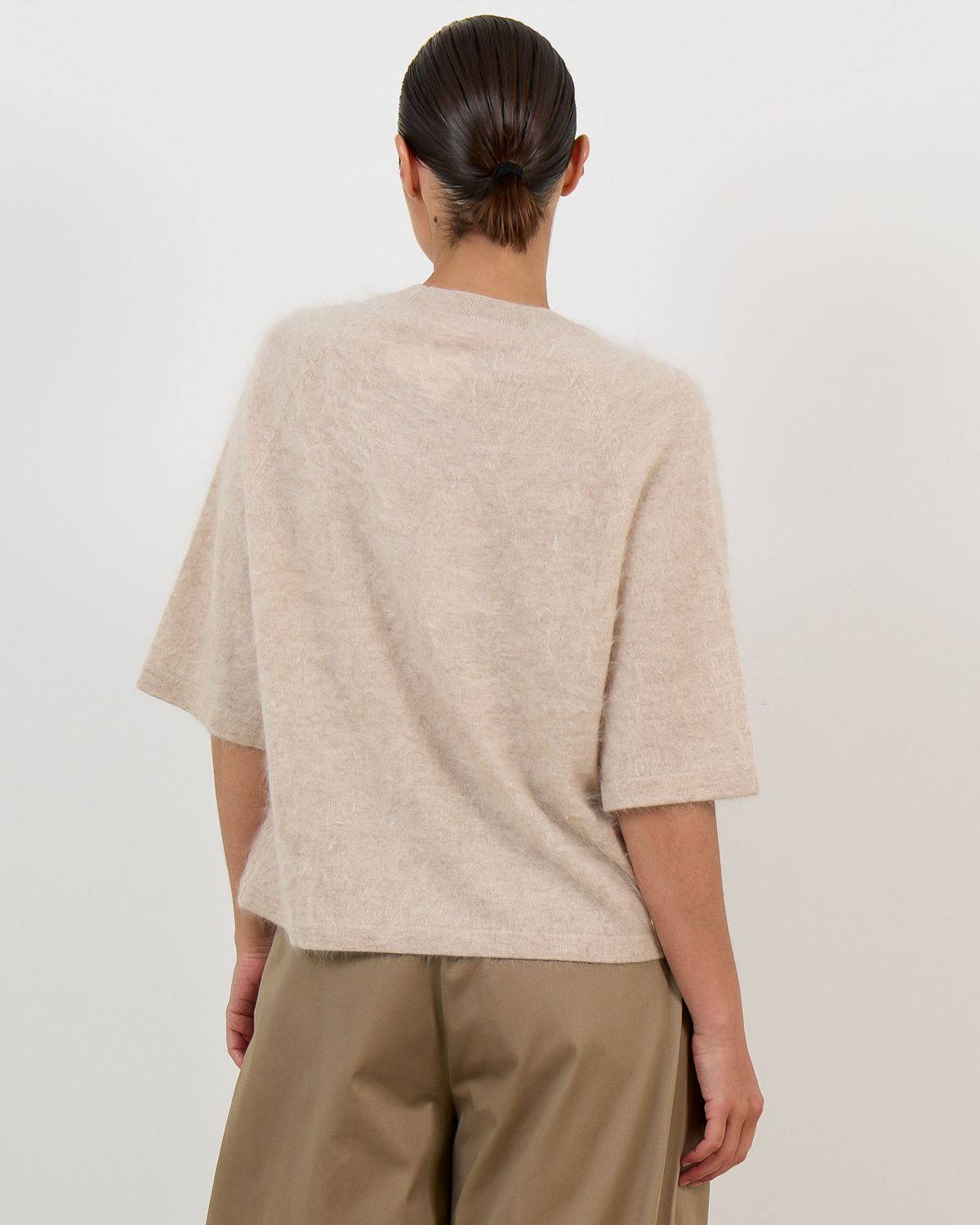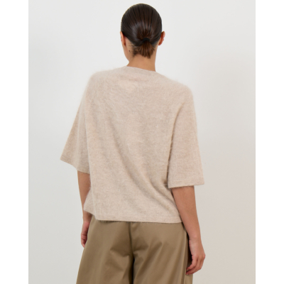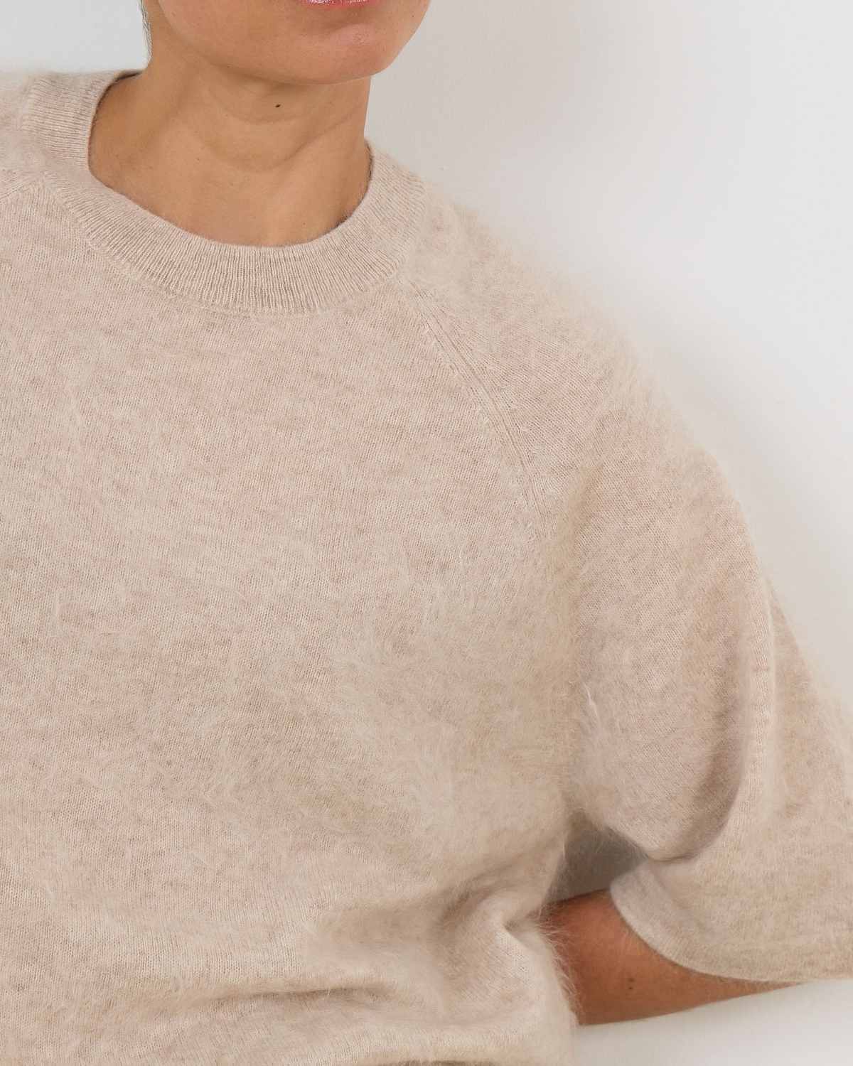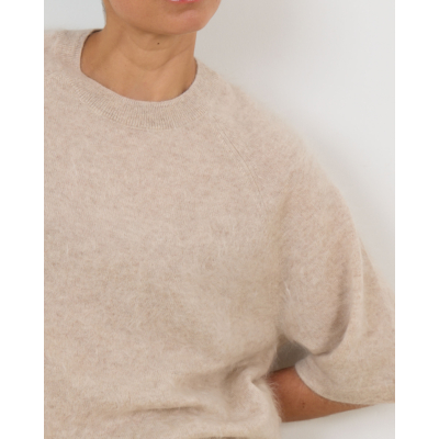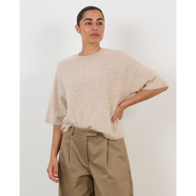 Deze cashmere trui in beige straalt pure luxe uit met zijn zachte brushed finish. De 100% cashmere stof voelt heerlijk zacht aan en biedt ultiem draagcomfort. Met korte mouwen en een klassieke ronde hals krijg je een moderne twist op de traditionele trui. De losvallende pasvorm zorgt voor een elegante, ontspannen uitstraling die perfect aansluit bij de hedendaagse damesmode trends.