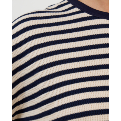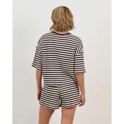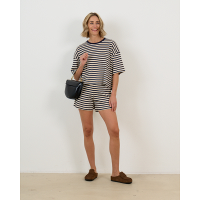Dit gestreepte shirt van Ame Antwerp combineert tijdloze elegantie met moderne comfort. Het opvallende streepdessin in ecru en marine kleuren geeft dit stuk karakter en verfijning. Vervaardigd uit 100% organisch katoen biedt het shirt een zachte textuur en optimaal draagcomfort. De regular fit pasvorm zorgt voor een flatteuse silhouet, terwijl de korte mouwen en ronde halslijn zorgen voor een clean, eigentijdse uitstraling.