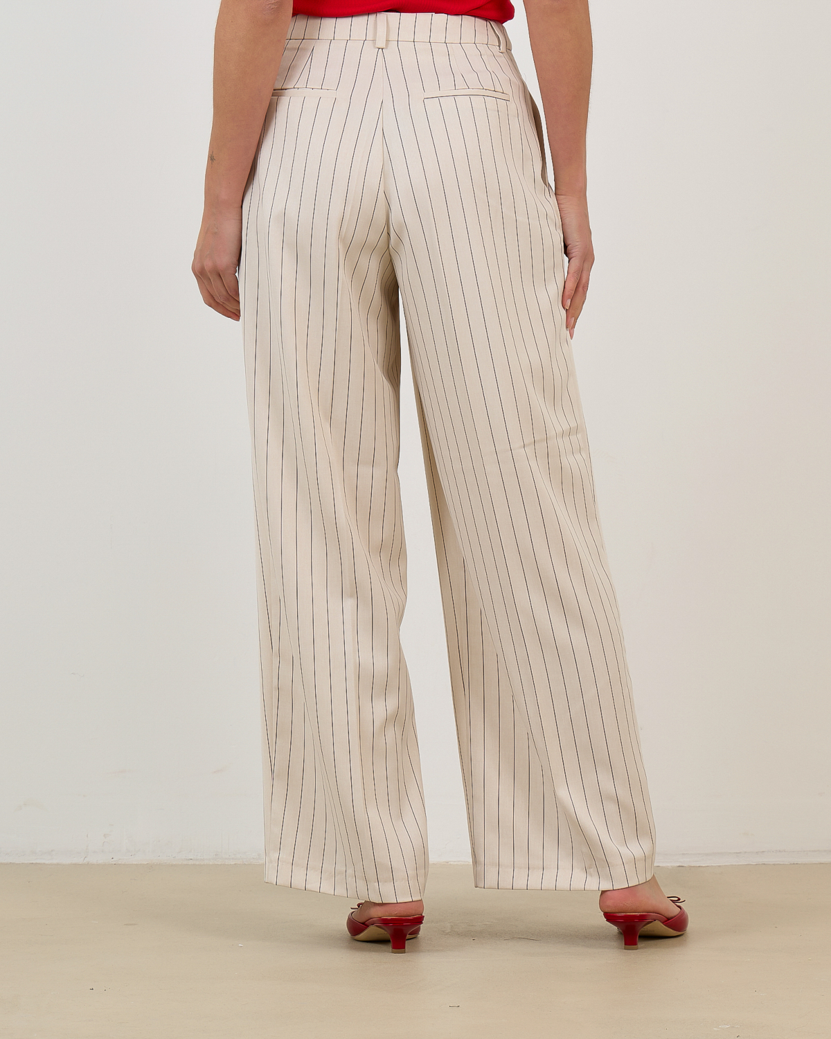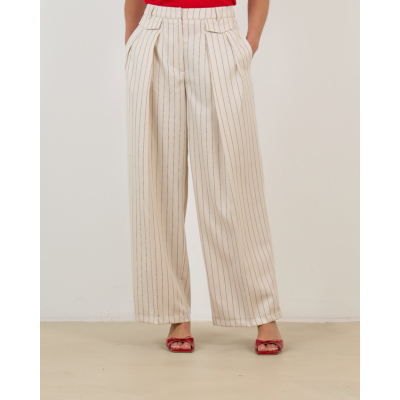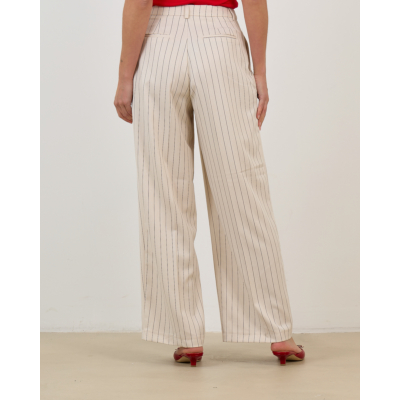 Deze elegante wide leg pantalon van Ame Antwerp combineert stijl met comfort. De crèmewitte kleur met fijne donkere strepen creëert een verfijnde uitstraling. De regular fit pasvorm met elastische tailleband zorgt voor optimaal draagcomfort. Uitgevoerd in een hoogwaardige stofsamenstelling van 83% polyester, 14% viscose en 2% elastaan. Functionele steekzakken en wijd uitlopende pijpen completeren het ontwerp.