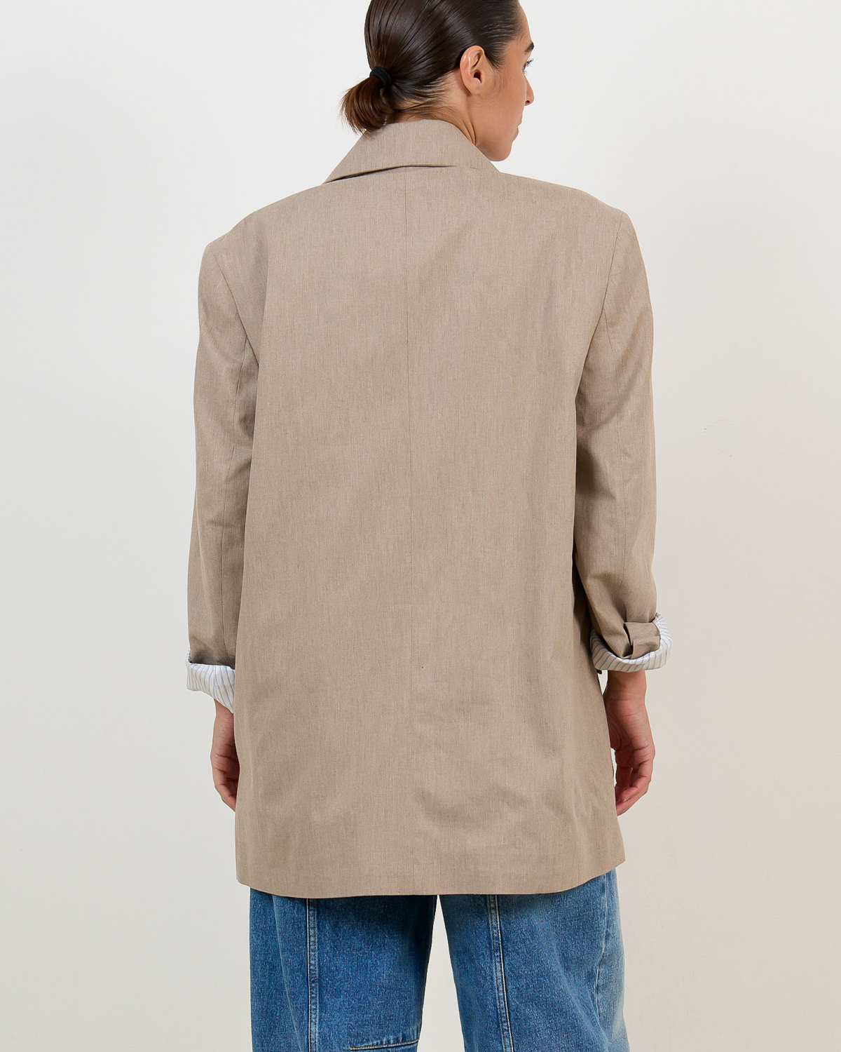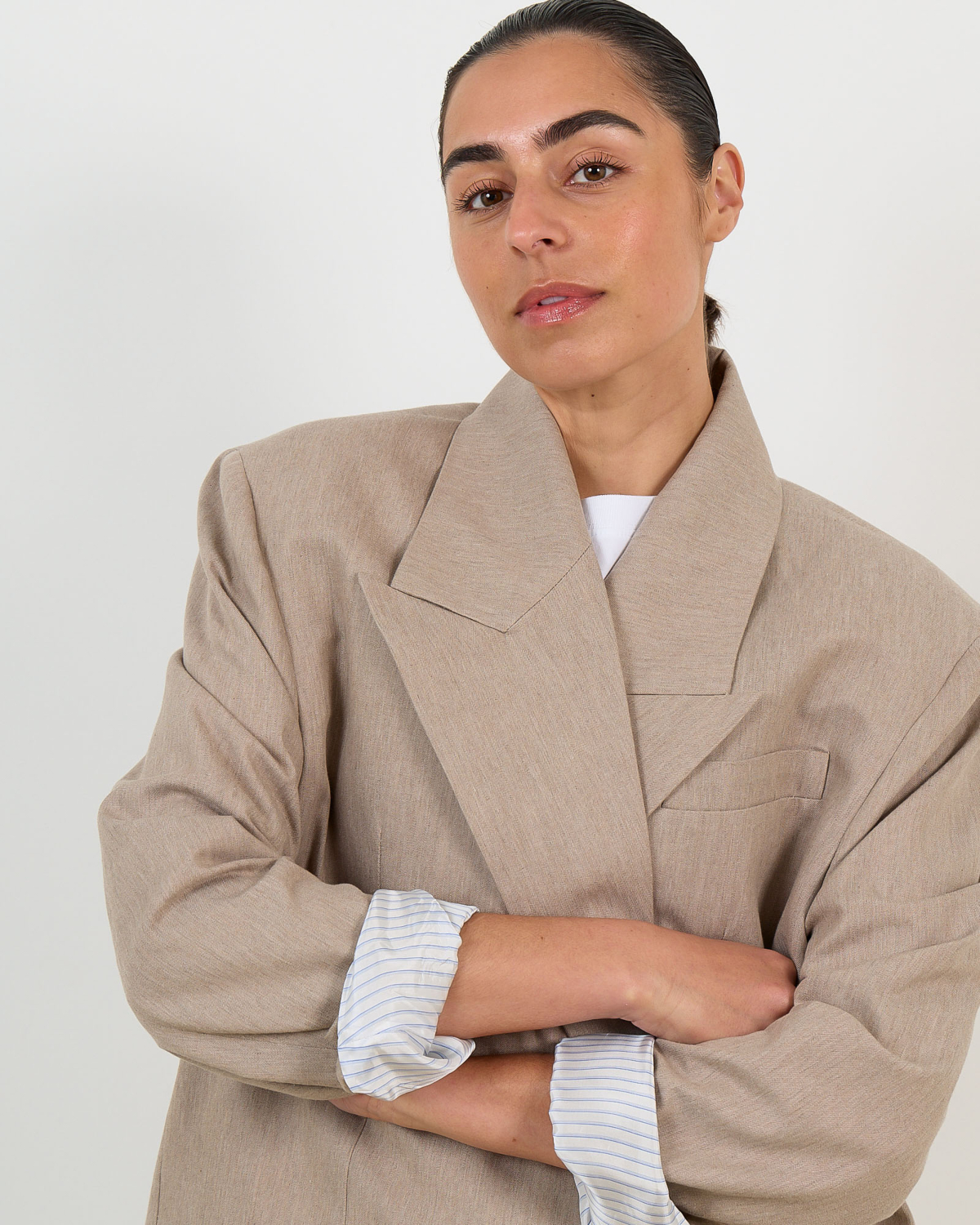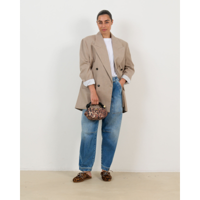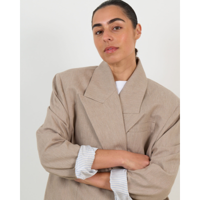 Voor jouw dames kleding collectie vormt deze Oversized Taupe Blazer Natan van Ame Antwerp een veelzijdige basis. Draag hem open over een wit T-shirt met straight leg jeans voor een casual chique look. Combineer met een midi rok en blouse voor een zakelijke uitstraling, of style hem met wijde pantalons voor een volledig oversized ensemble.