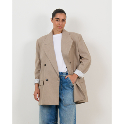 Deze oversized blazer in taupe straalt moderne elegantie uit. De dubbele knoopsluiting en brede revers creëren een krachtige silhouet, terwijl de verlengde pasvorm zorgt voor een hedendaagse twist op de klassieke blazer. Vervaardigd uit 100% katoen biedt dit exemplaar van Ame Antwerp zowel comfort als stijl. De gestructureerde schouders en doorlopende kraag completeren het verfijnde ontwerp.