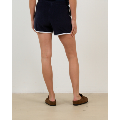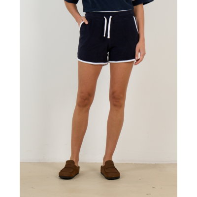 Deze stijlvolle marineblauwe short van zachte katoen combineert comfort met een moderne sportieve uitstraling. De regular fit pasvorm zorgt voor optimale bewegingsvrijheid, terwijl de witte contrastbiesjes aan de zomen een verfijnd detail toevoegen. De verstelbare trekkoord in de elastische tailleband biedt een perfecte pasvorm. Twee praktische zijzakken maken dit ontwerp compleet. Het hoogwaardige katoenmix materiaal (74% katoen, 26% polyester) geeft een luxueuze textuur.