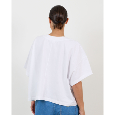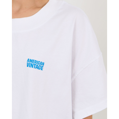 Dit witte cropped t-shirt straalt een eigentijdse nonchalance uit. De oversized pasvorm zorgt voor een relaxte uitstraling, terwijl de korte lengte een moderne twist geeft. Het shirt is gemaakt van 100% katoen en heeft korte mouwen met een klassieke ronde hals. Op de borst staat het blauwe American Vintage logo geprint, wat zorgt voor een opvallend designdetail.