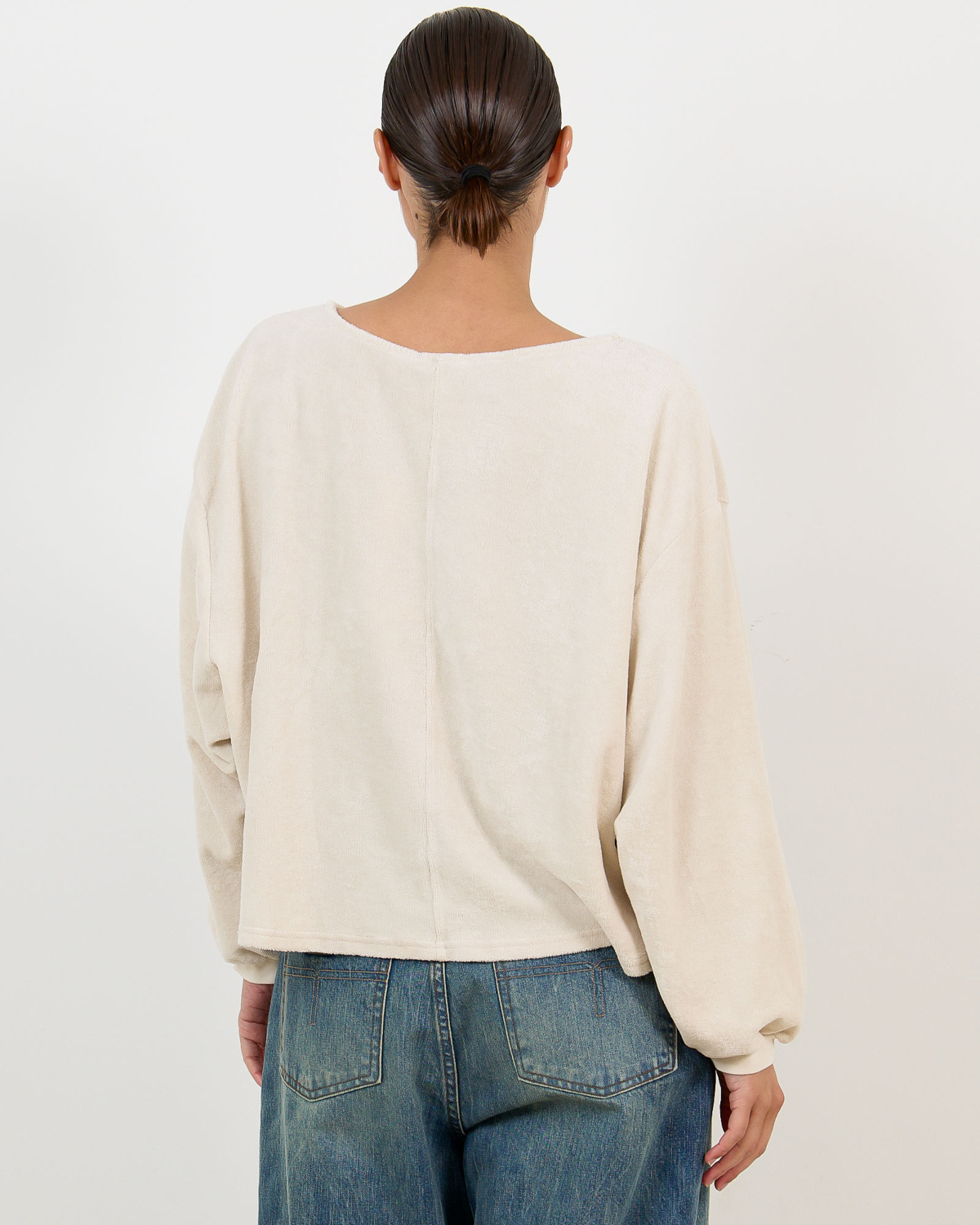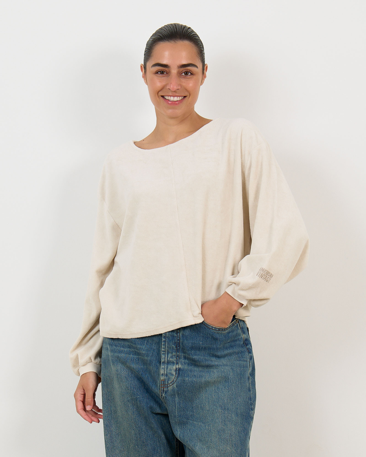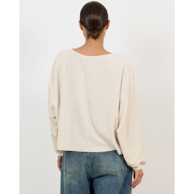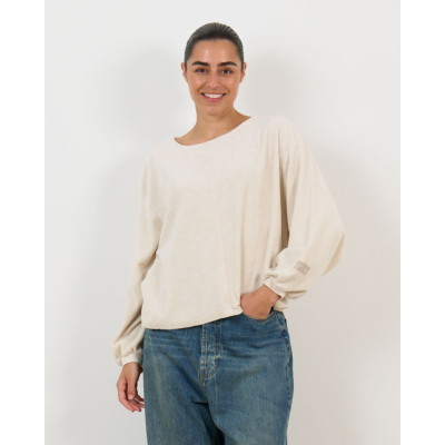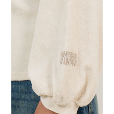 Deze crèmewitte sweater van American Vintage combineert comfort met stijlvol design. De relaxed fit en lange mouwen zorgen voor een casual uitstraling, terwijl het geborduurd "AMERICAN VINTAGE" logo op de zoom een subtiele merkaccent toevoegt. Het materiaal bestaat uit een mix van 50% biologische katoen en 50% gerecycled katoen, wat zorgt voor een zachte draagervaring. De ronde hals en oversized pasvorm maken dit een veelzijdig item voor verschillende gelegenheden.