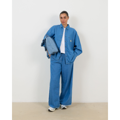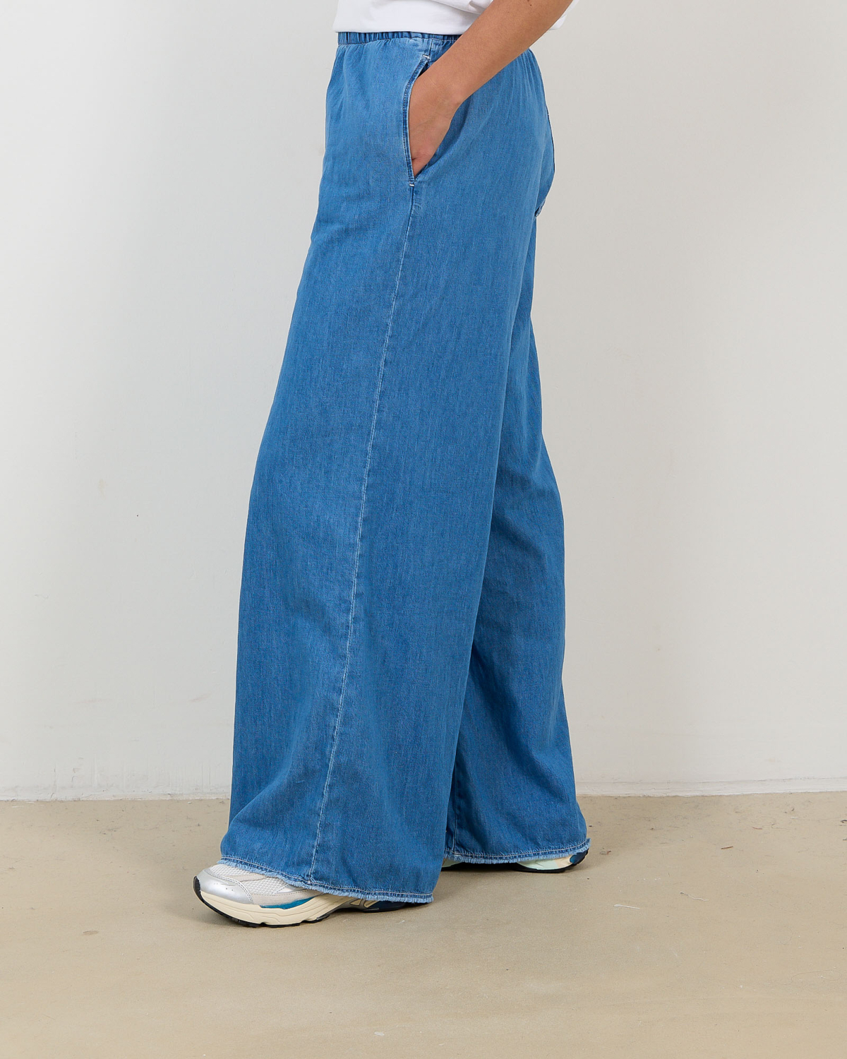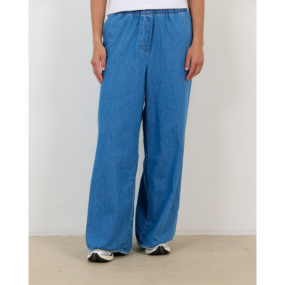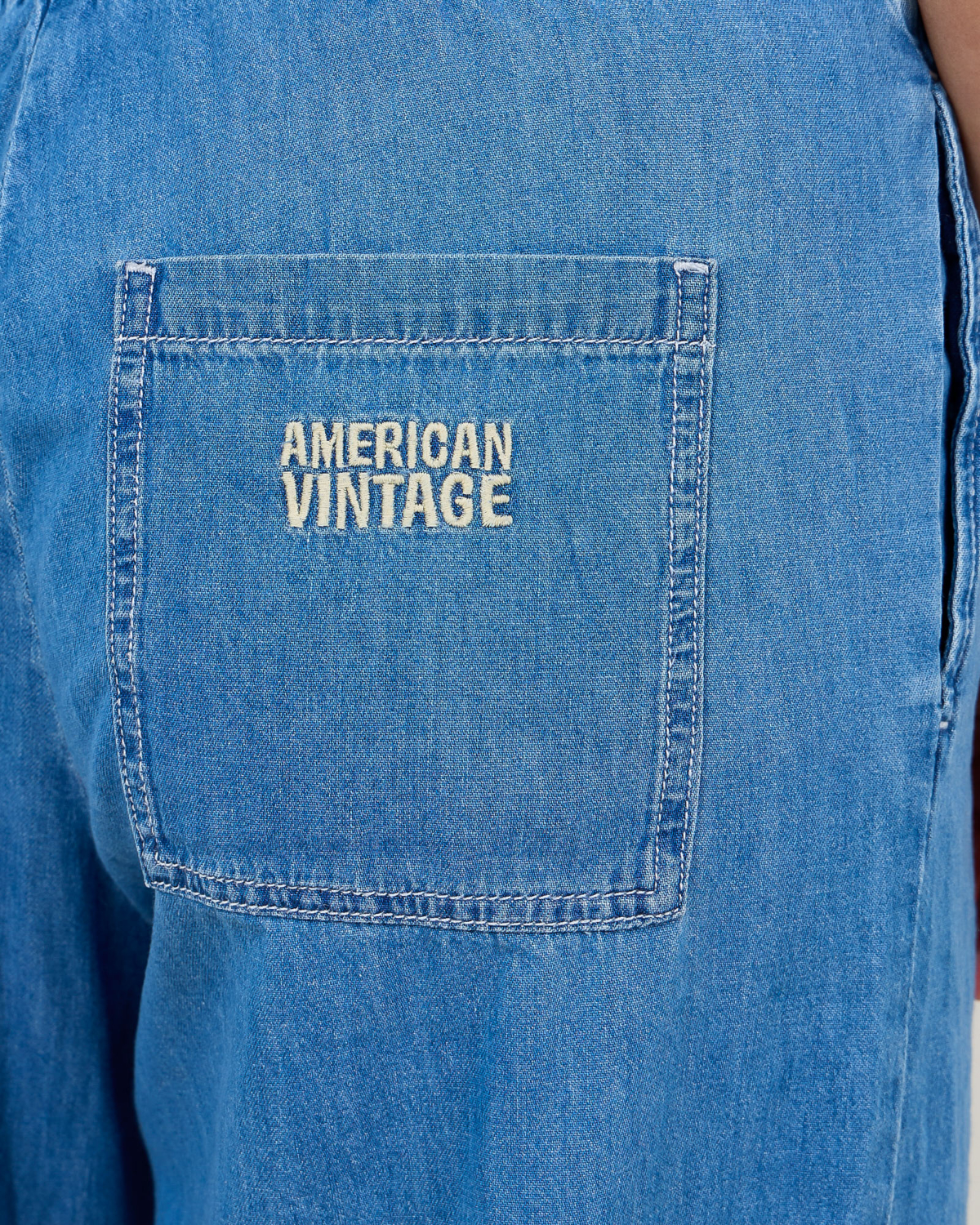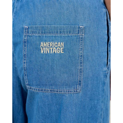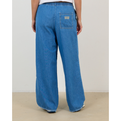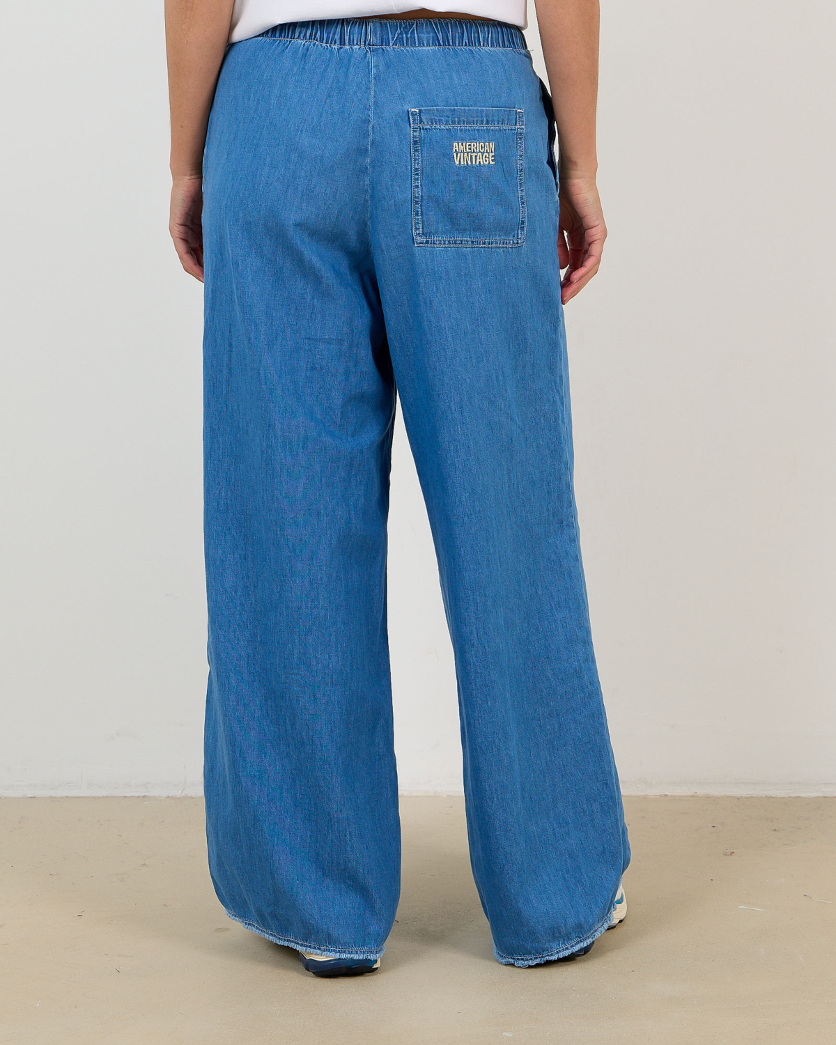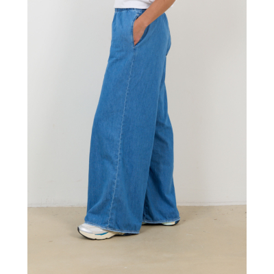 Deze elegante denim pantalon in een prachtige jeansblauw tint combineert comfort met stijl. De oversized fit en zachte 100% katoen zorgen voor een luxueuze draagervaring, terwijl de elastische tailleband optimaal comfort biedt. Het opvallende American Vintage logo op de achterzak geeft dit item een authentieke touch. De wijde, rechte pijpen creëren een moderne silhouet die zowel casual als chic oogt.