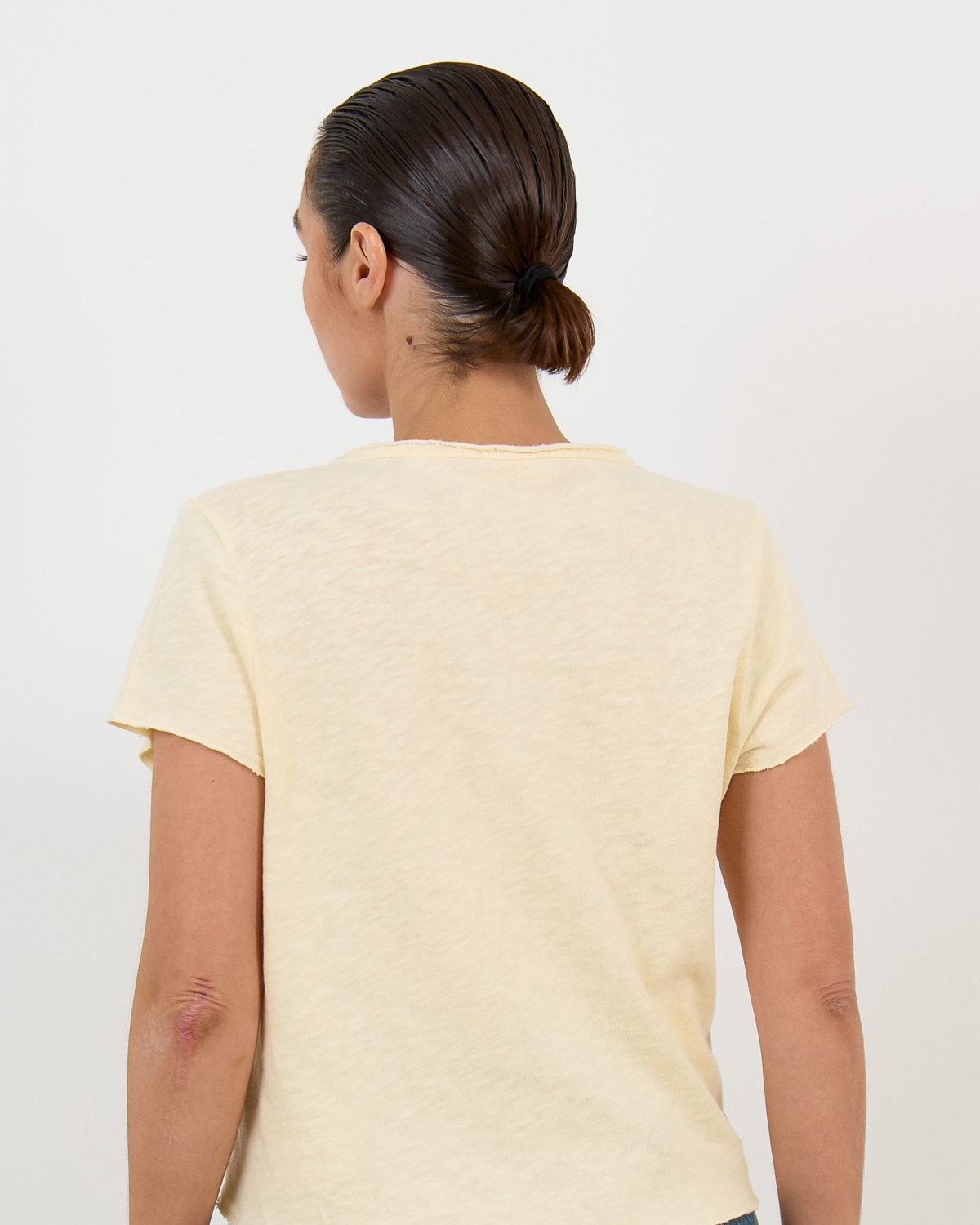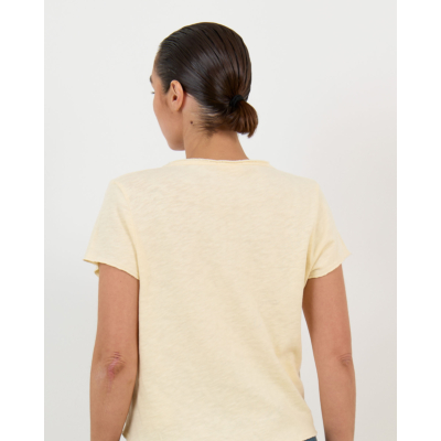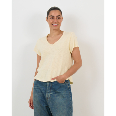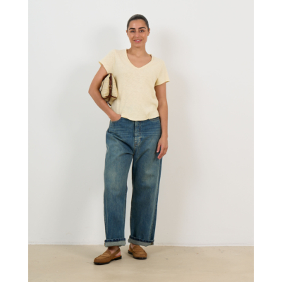 Het Sonoma Gemeleerd T-Shirt met V-Hals Vintage Vanilla van American Vintage combineer je stijlvol met een high-waisted denim of een elegante midi rok. Voor een casual look draag je dit dames kleding American Vintage item onder een oversized blazer, of kies voor een verfijnde combinatie met een tailored broek en statement accessoires.