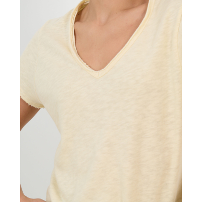 Dit gemeleerde t-shirt in een warme vanilletint straalt vintage charme uit. De zachte v-halslijn en korte mouwen geven het shirt een elegante uitstraling, terwijl het 100% katoenen materiaal zorgt voor optimaal draagcomfort. De relaxed fit biedt vrijheid van beweging en creëert een ontspannen silhouet. Het gemeleerde dessin geeft dit basic item een speelse twist die perfect past bij de moderne vrouw.