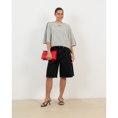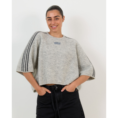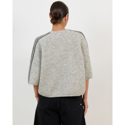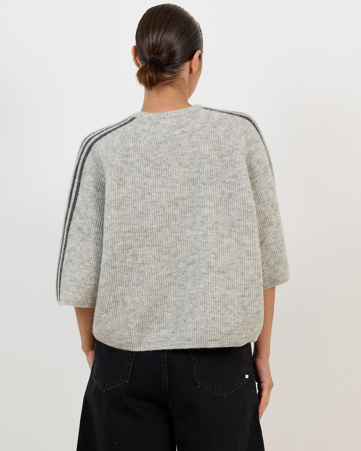 Deze gemêleerde grijze trui combineert verfijning met een sportieve twist. De luxueuze materiaalsamenstelling van alpaca, wol, polyamide en elastaan zorgt voor een zachte textuur en comfortabele stretch. De relaxed fit en driekwart mouwen creëren een elegante silhouet, terwijl de contrasterende strepen langs de mouwen een modern accent toevoegen. Het geribde breisel en de ronde hals completeren het tijdloze ontwerp.