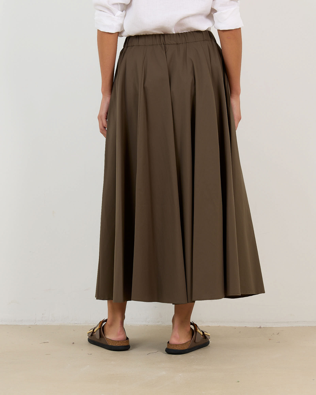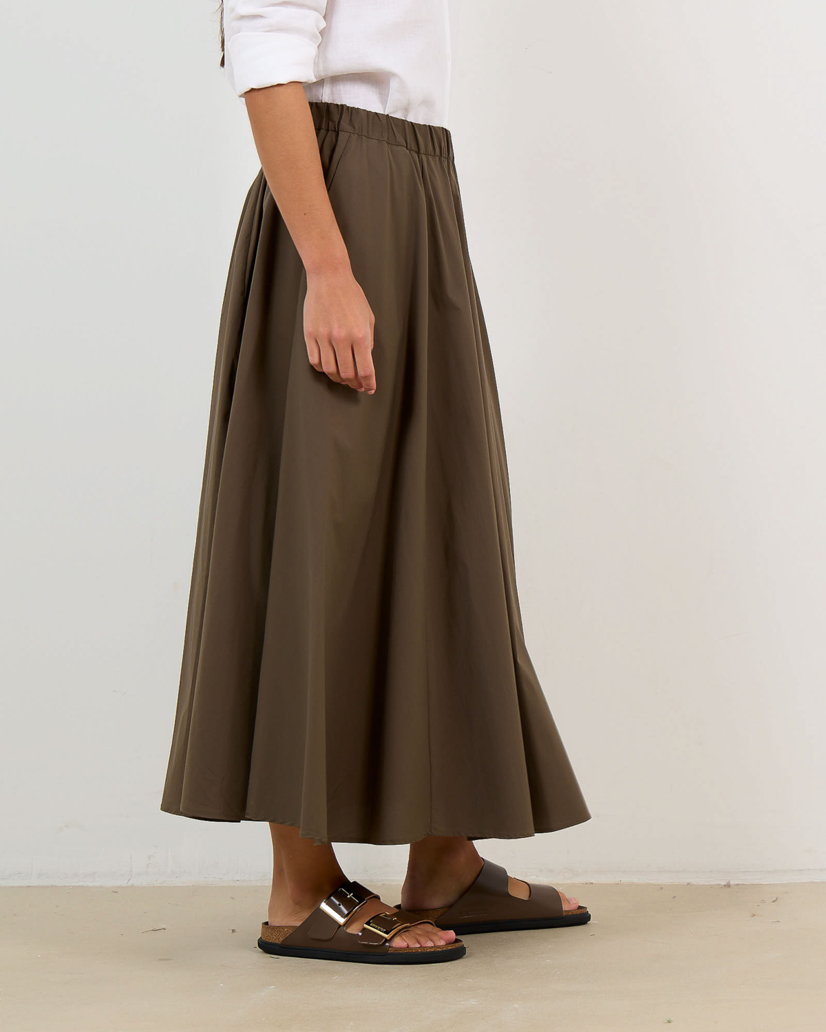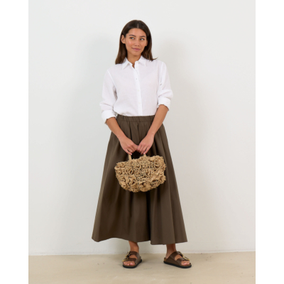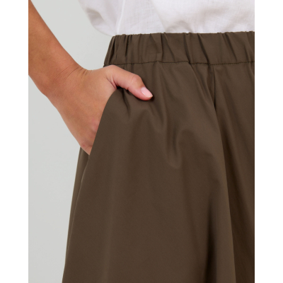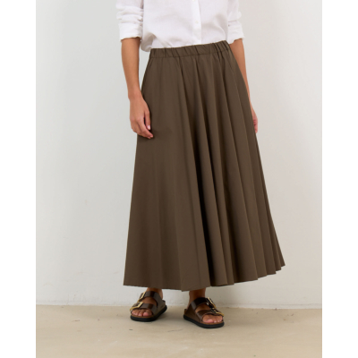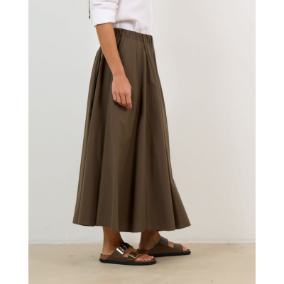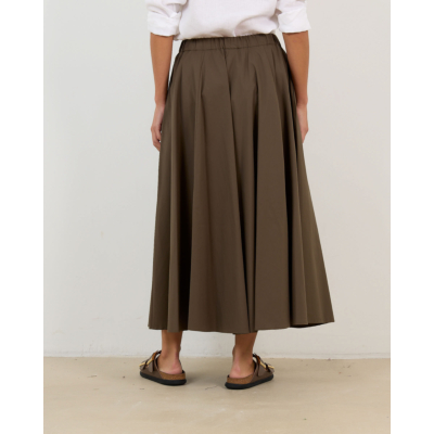 Deze elegante midi rok in kaki groen combineert poplin en nylon voor een verfijnde textuur. De losvallende pasvorm met elastische tailleband zorgt voor optimaal comfort, terwijl de volumineuze A-lijn silhouet tijdloze vrouwelijkheid uitstraalt. Vervaardigd uit een hoogwaardige mix van 62% katoen, 35% polyamide en 3% elastaan biedt dit ontwerp de perfecte balans tussen structuur en bewegingsvrijheid.
