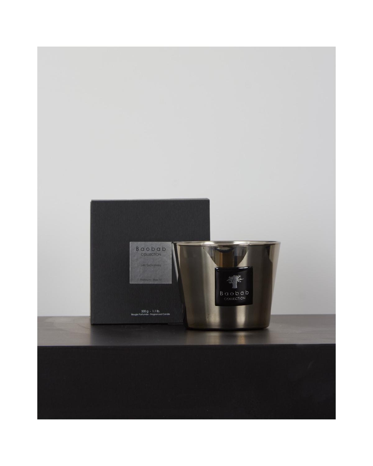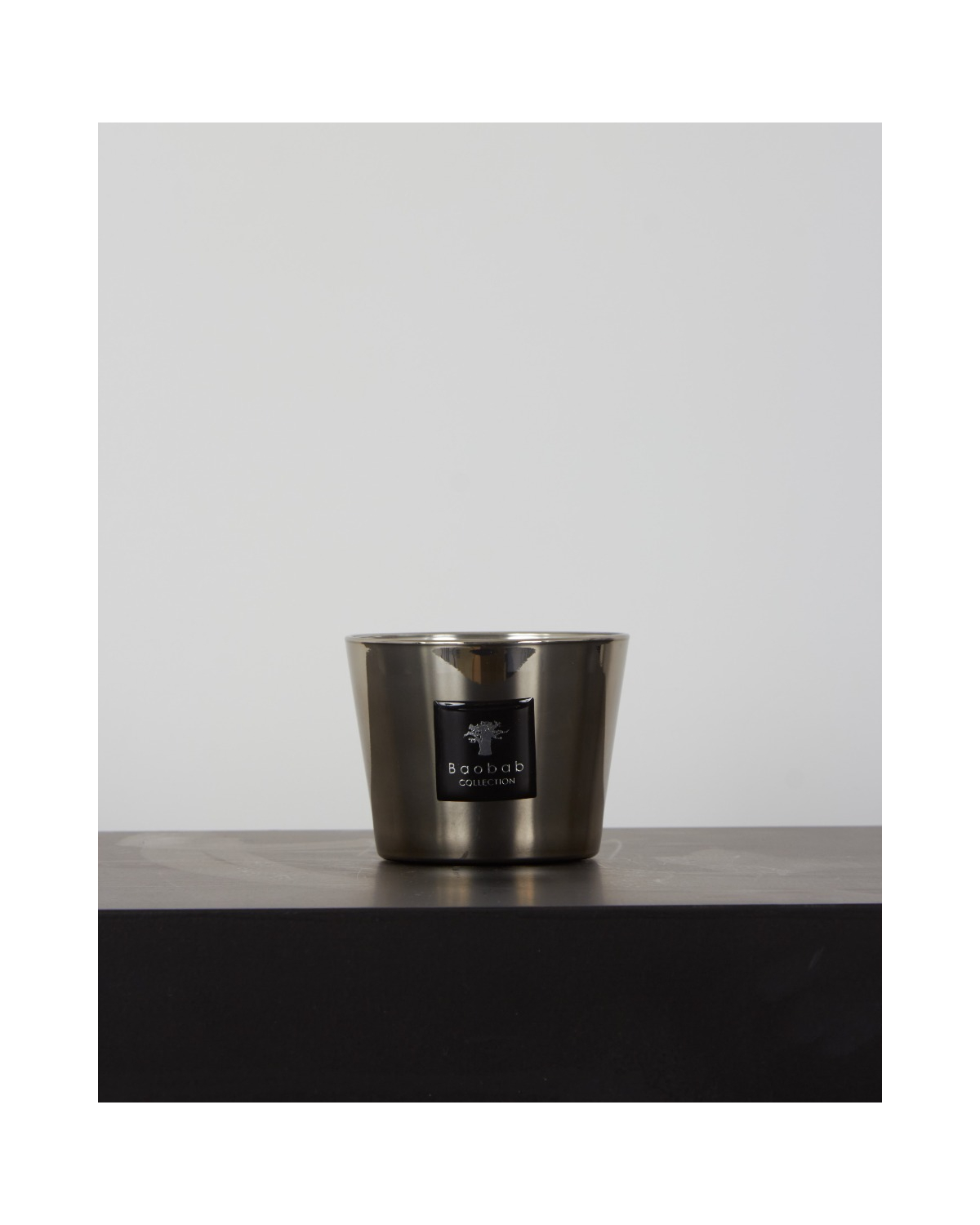 Handgemaakte geurkaars Platinum van het merk Baobab Collection. De Platinum geurkaars is samengesteld uit de geurnoten amber en citrus.