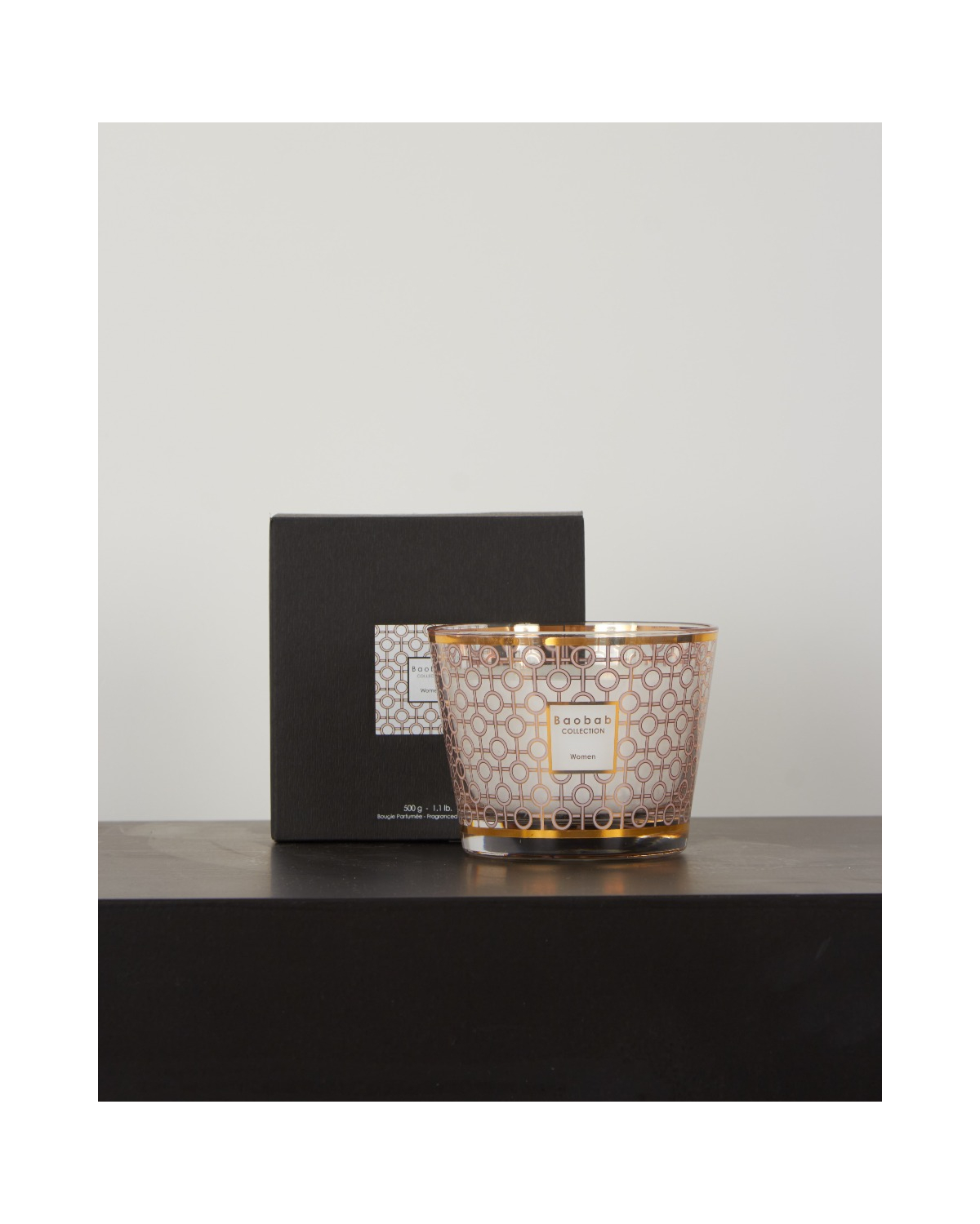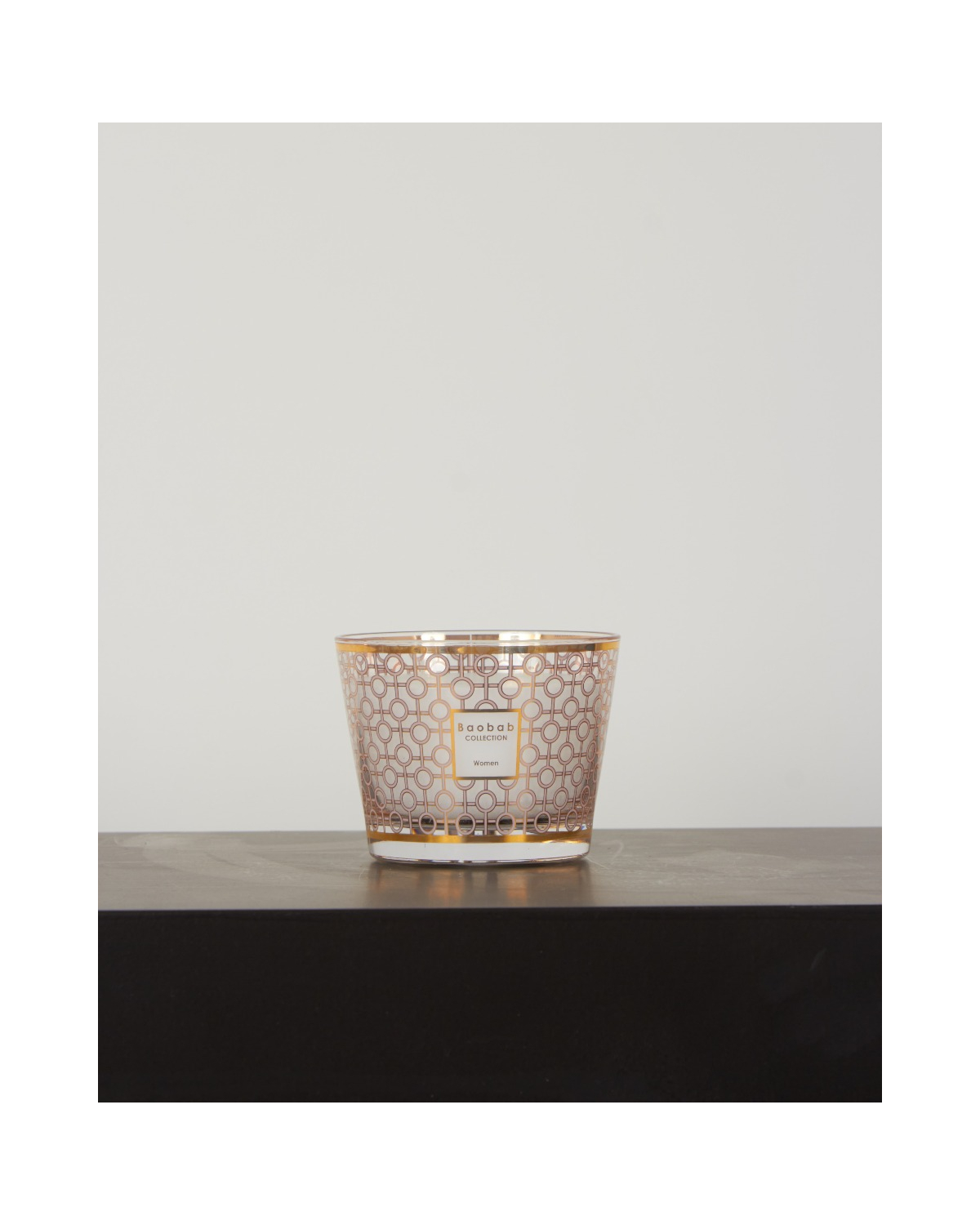 Handgemaakte geurkaars Women van het merk Baobab Collection. De Women geurkaars is samengesteld uit de geurnoten magnolia, roos en musk. Het glas van de geurkaars Women is bedekt met een delicate zeefdruk uit 9 karaats geel goud.