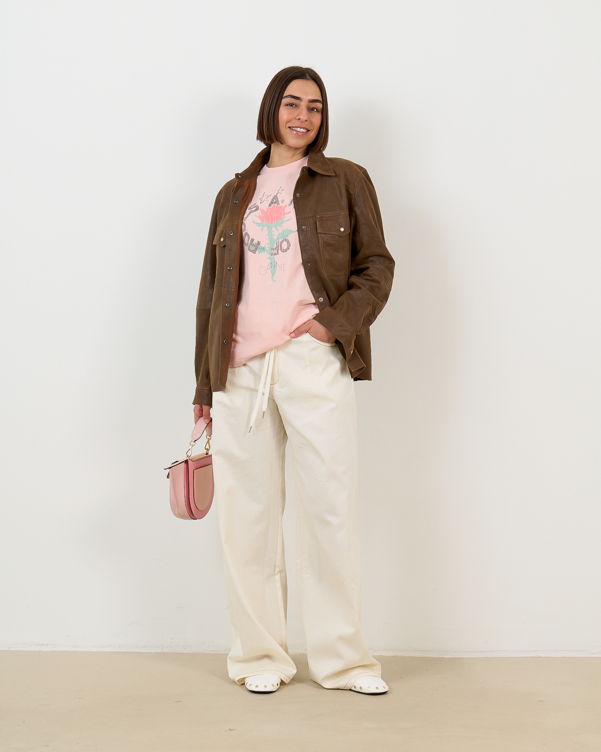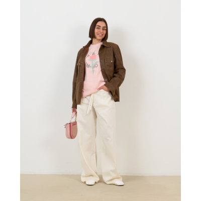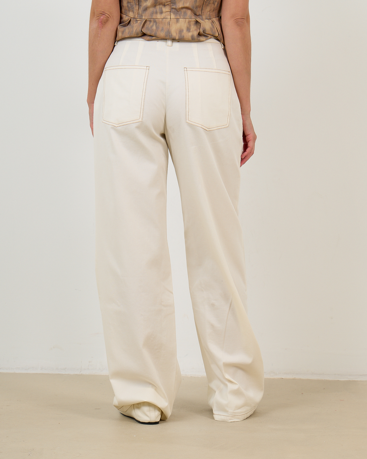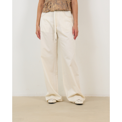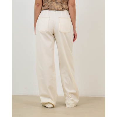 Deze elegante off-white pantalon van 100% katoen combineert eigentijdse stijl met verfijnd comfort. De opvallende bruine stiksels creëren een moderne twist op het klassieke design, terwijl de wide leg pasvorm met extra lange lengte zorgt voor een vloeiende, elegante silhouet. De hoogwaardige katoen voelt zacht aan en biedt optimale bewegingsvrijheid. Met functionele zakken aan voor- en achterzijde en een comfortabele elastische tailleband biedt deze pantalon zowel stijl als functionaliteit.