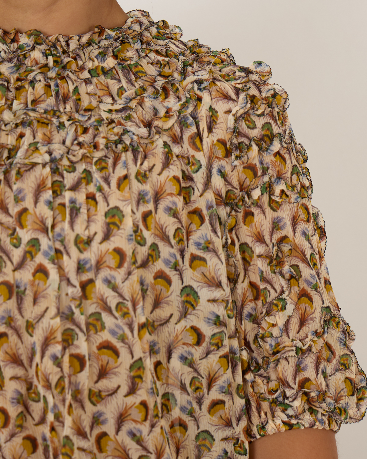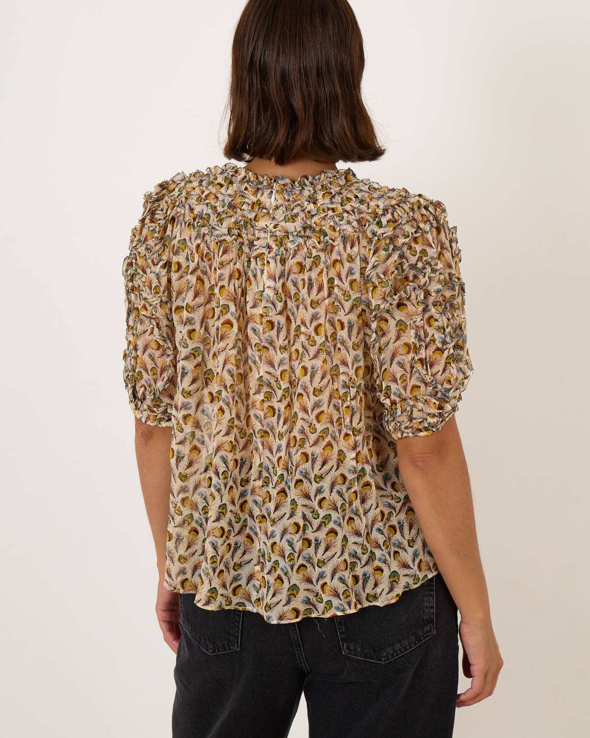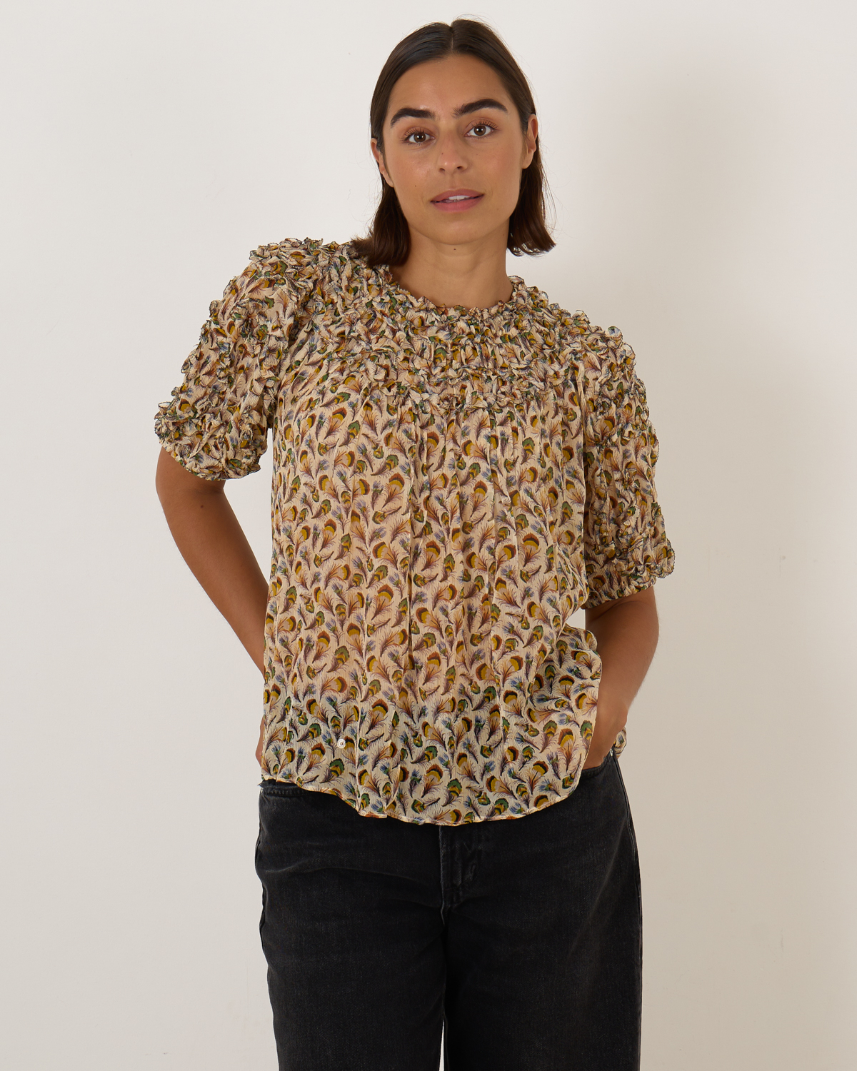De Isolda blouse van Ulla Johnson in beige kleur met bloemen print is een verfijnd silhouet dat moeiteloos elegantie ademt. Vervaardigd uit licht gekreukeld zijden chiffon, omsluit deze blouse het lichaam losjes en geeft een nonchalant gestylede uitstraling. Subtiele gesmoktedetails omlijsten de halslijn en dragen bij aan een zachte, romantische touch, terwijl de korte mouwen met elastische boorden een vleugje volume en speelsheid toevoegen.