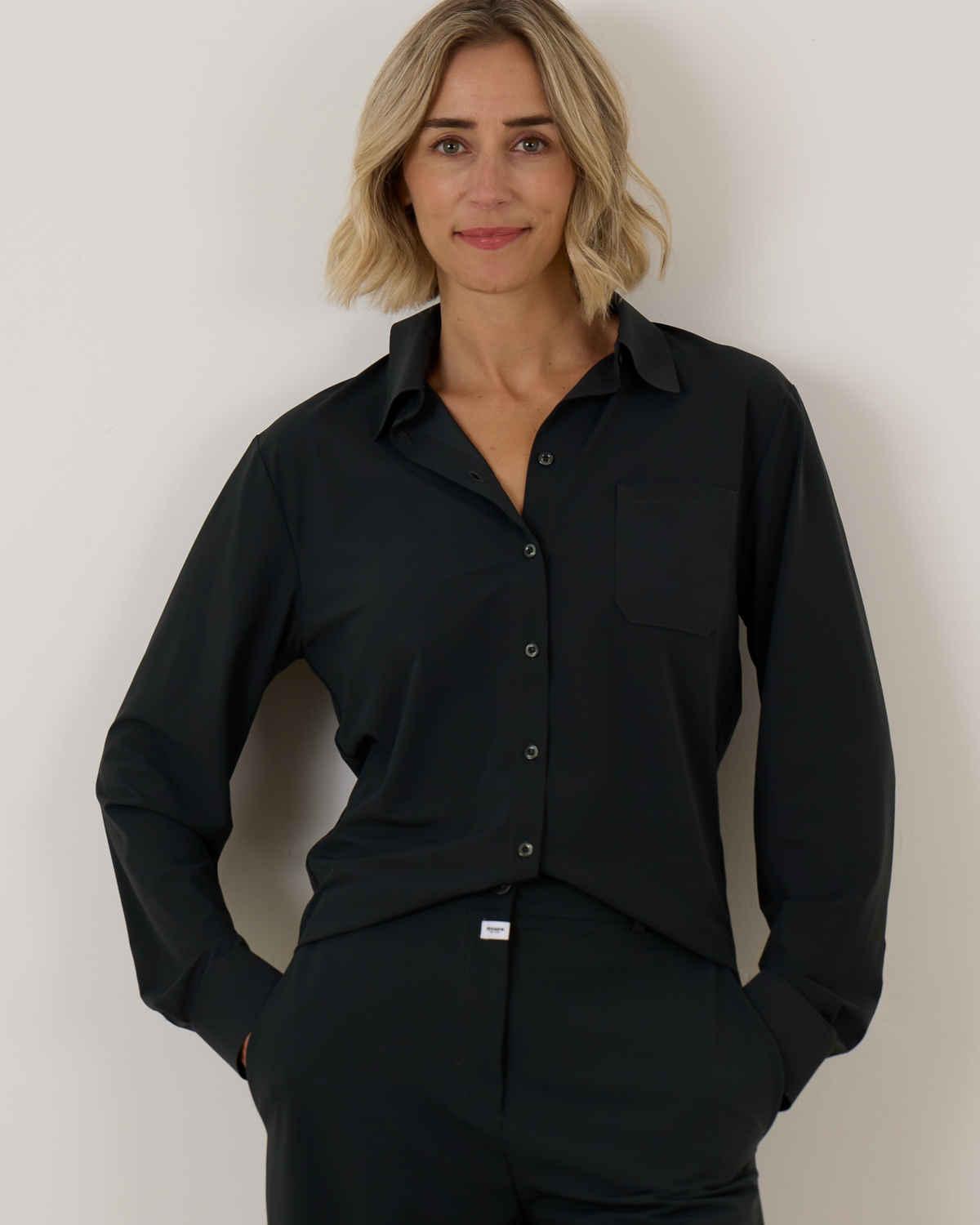 Deze elegante lichtgrijze blouse combineert stijl met comfort door de hoogwaardige materiaalmix van 75% polyamide en 25% elastaan. De regular fit pasvorm zorgt voor een flatteuze uitstraling, terwijl de klassieke kraag en knoopsluiting tijdloze elegantie uitstralen. De lange mouwen met manchetknopen completeren het verfijnde ontwerp perfect.