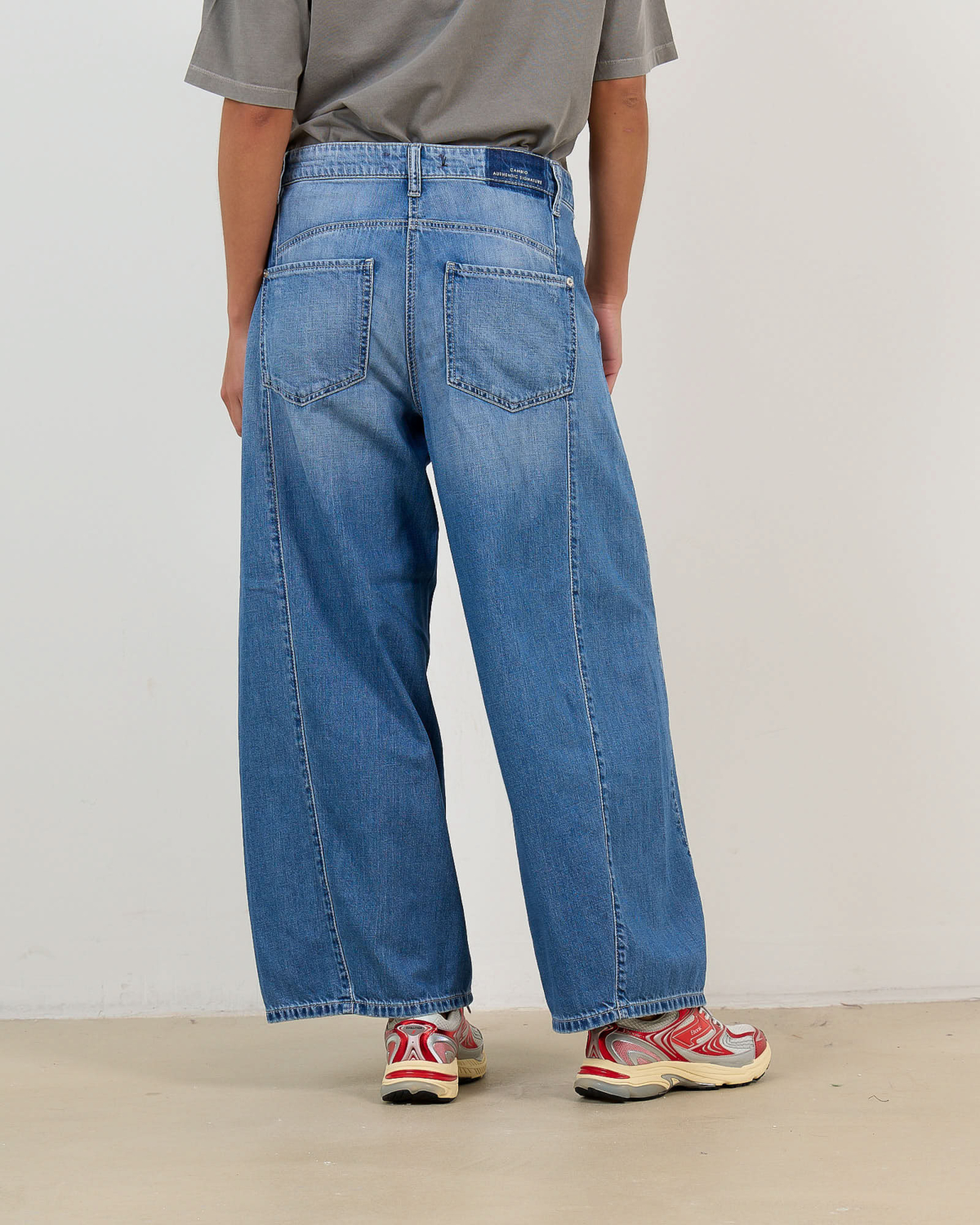 Deze wide leg jeans in denim blauw combineert de cropped lengte met een vrouwelijke regular fit. Het 100% katoenen materiaal biedt optimaal draagcomfort, terwijl de klassieke vijf-zakken constructie en knoopsluiting zorgen voor een tijdloze uitstraling. De wijde pijpen creëren een elegant silhouet dat perfect aansluit bij de huidige modetrends.