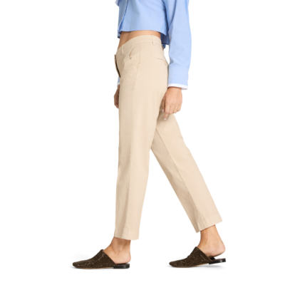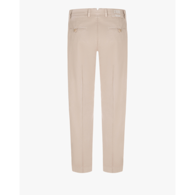 Deze elegante pantalon in zachte zandkleur combineert comfort met verfijnde stijl. De katoen-elastaan blend (97% katoen, 3% elastaan) zorgt voor optimaal draagcomfort en perfecte pasvorm. Met zijn regular fit silhouet, stijlvolle riemlussen en twee praktische achterzakjes straalt deze pantalon moderne elegantie uit. De knoopsluiting en tailleband met contrasterende details geven het geheel een luxe afwerking.