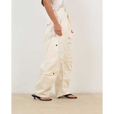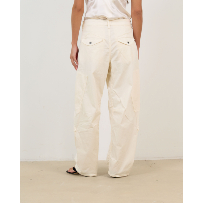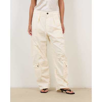 Deze stoere cargobroek in een zachte crèmekleurige tint combineert utility-stijl met moderne elegantie. De barrel fit zorgt voor een ontspannen pasvorm die toch verfijnd oogt. Het organisch katoen met elastaan biedt optimaal comfort, terwijl de knoopsluiting en functionele cargozakken op de zijkanten een speels accent toevoegen. De brede pijpen en hoge taille creëren een flatteuse silhouet.