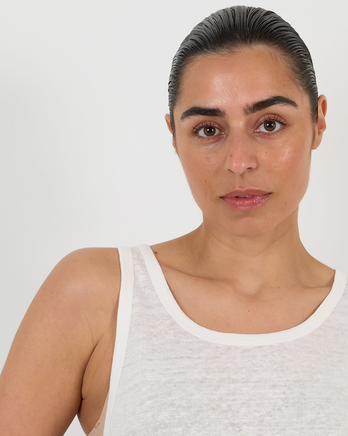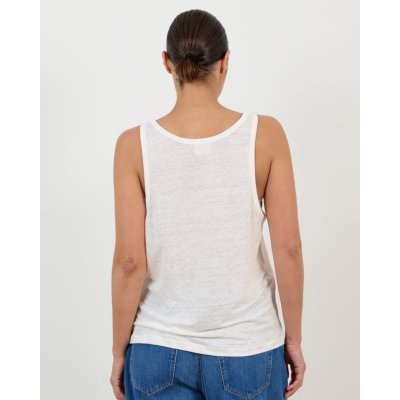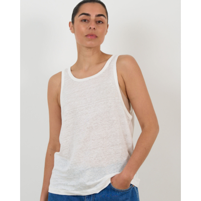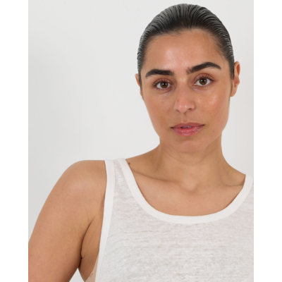 Deze elegante tank top in ecru straalt pure verfijning uit. Vervaardigd van 100% linnen biedt dit stuk optimaal draagcomfort en natuurlijke ademende eigenschappen. De losvallende pasvorm zorgt voor een relaxte maar stijlvolle uitstraling, terwijl de ronde hals en brede schouderbandjes een tijdloze elegantie creëren. Het natuurlijke linnen geeft de tank top een luxueuze textuur en moderne uitstraling.