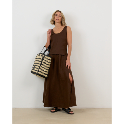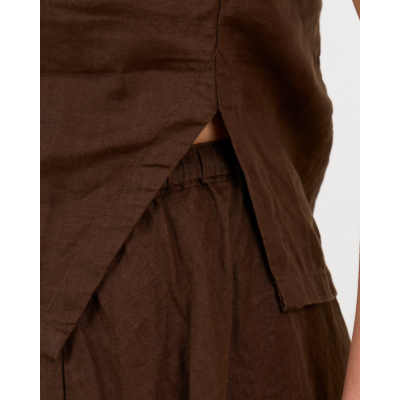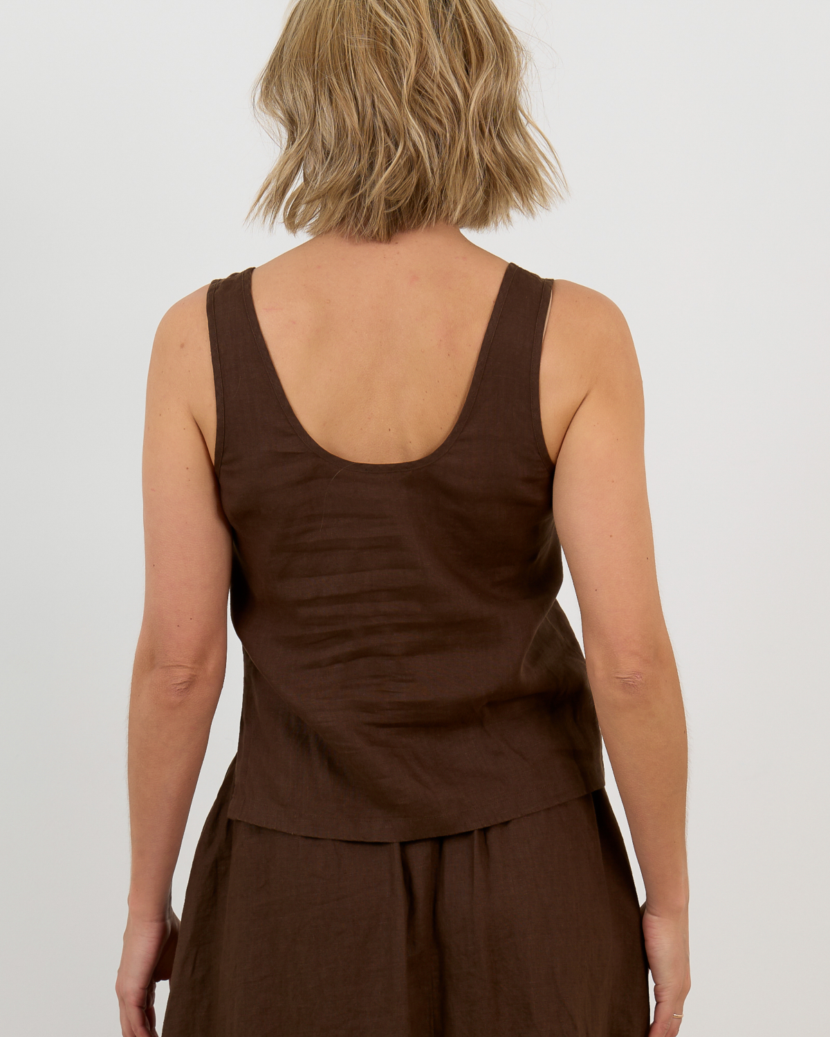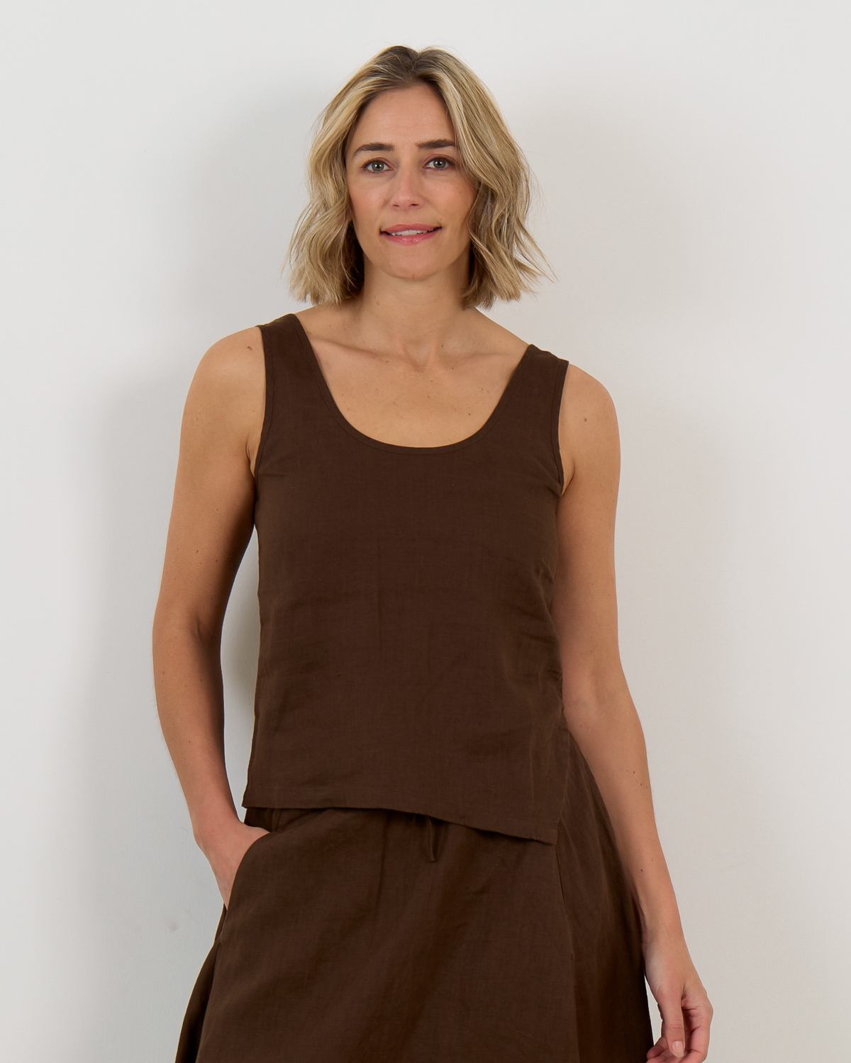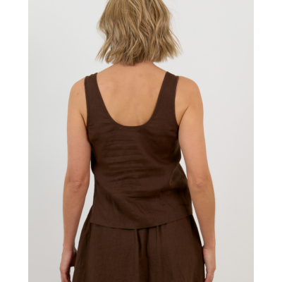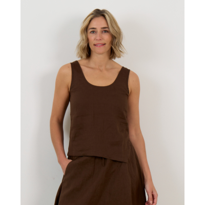 Deze elegante donkerbruine top straalt moderne verfijning uit. Gemaakt van 100% linnen, biedt het kledingstuk een natuurlijk comfort en tijdloze uitstraling. De relaxed-fit zorgt voor een comfortabele pasvorm, terwijl de ronde halslijn en tanktop-model zorgen voor een stijlvolle look. De rijke bruine kleur geeft karakter aan je outfit en de kwaliteit van het linnen belooft langdurig draagplezier.