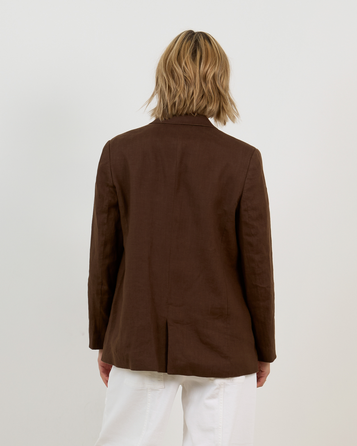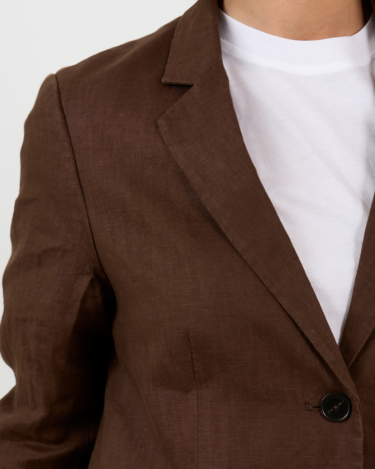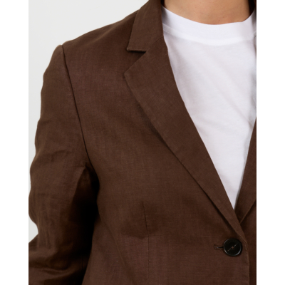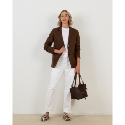 De chocolade linnen blazer van Closed combineert prachtig met een witte broek voor een frisse contrast. Draag deze blazer ook over een zwarte jurk voor een chique look, of style hem met een donkere jeans en neutrale top voor een casual-elegante uitstraling.