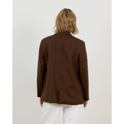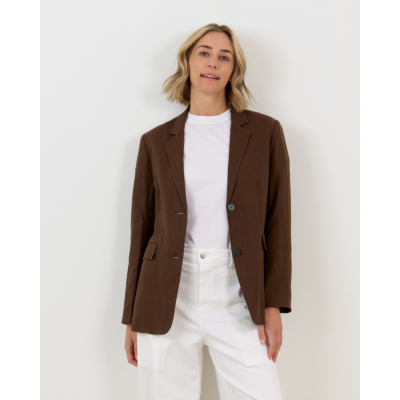 Deze chocolade blazer van 100% linnen combineert natuurlijke elegantie met moderne verfijning. Het klassieke revers en de dubbele knoopsluiting geven dit damesstuk een tijdloze uitstraling. De regular fit pasvorm zorgt voor een comfortabele dracht, terwijl de lange mouwen een stijlvolle silhouet creëren. De rijke donkerbruine kleur straalt warmte en klasse uit.