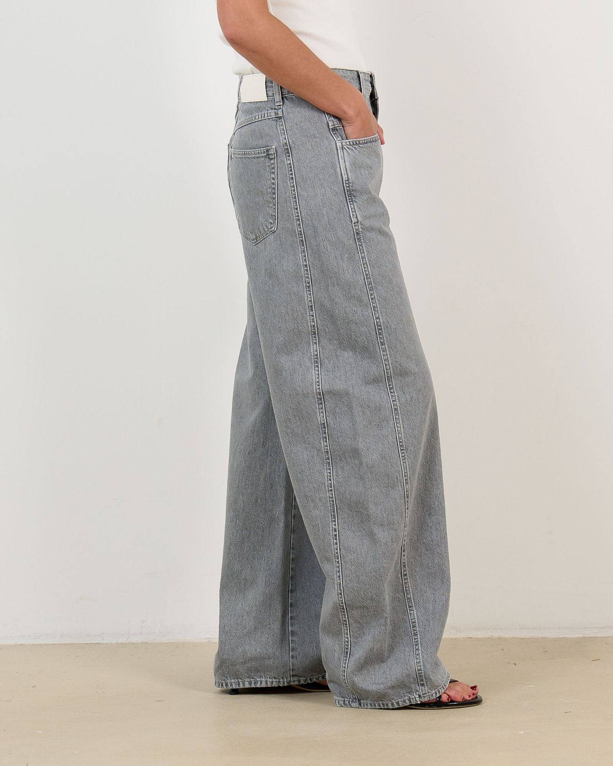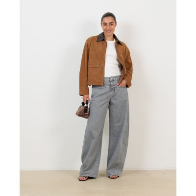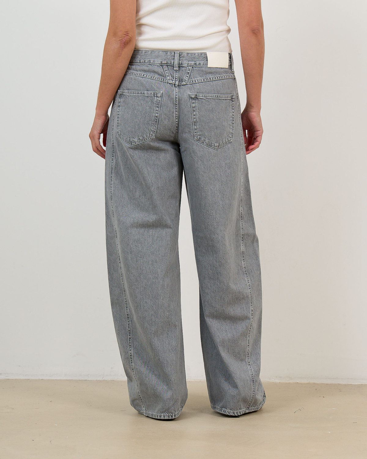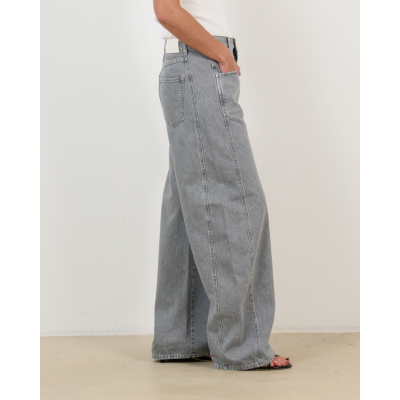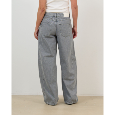 Deze grijze damesjeans straalt moderne elegantie uit met een speciaal dubbel tailleband ontwerp. Het hoogwaardige denim heeft een verfijnde grijze wassing die zowel edgy als tijdloos oogt. De ruime, rechte pasvorm zorgt voor optimaal draagcomfort, terwijl de klassieke vijfzakkenindeling en knoopsluiting praktische functionaliteit bieden. Het contrasterende leren label aan de achterzijde benadrukt de premium kwaliteit van deze bijzondere jeans.