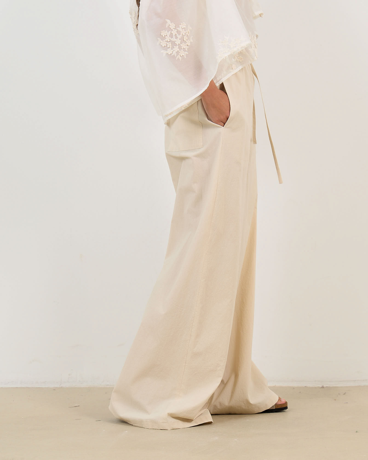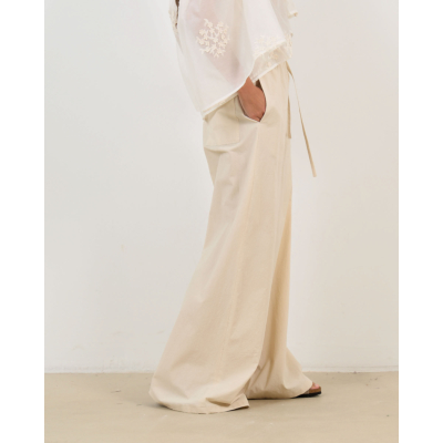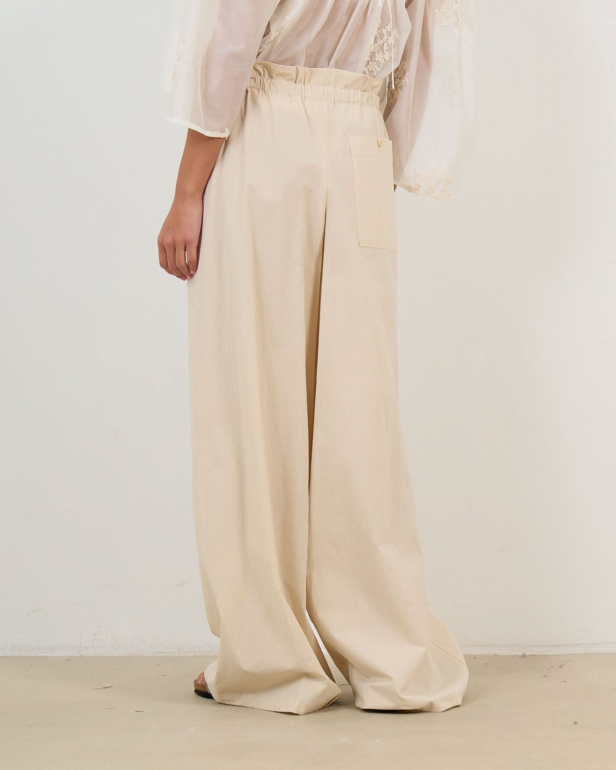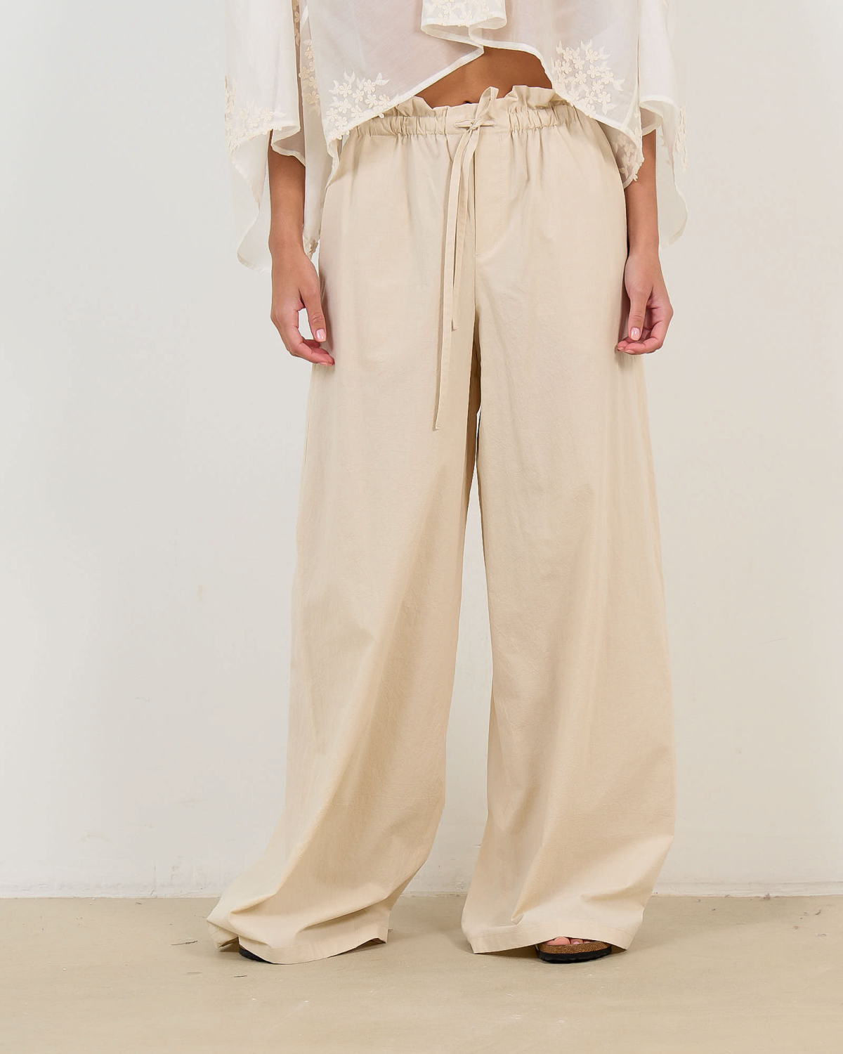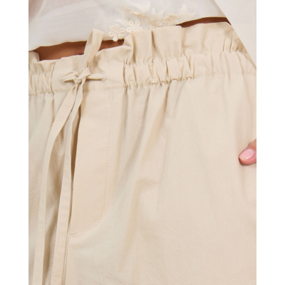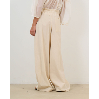 Deze beige katoenen pantalon combineert comfort met verfijnde stijl. De elastische paperbag taille en bijbehorende strikband zorgen voor een perfecte pasvorm, terwijl de losvallende snit bewegingsvrijheid biedt. Het 100% katoen geeft een luxueuze uitstraling en aangenaam draagcomfort. De wijde pijpen en praktische steekzakken maken dit een veelzijdige broek voor verschillende gelegenheden.