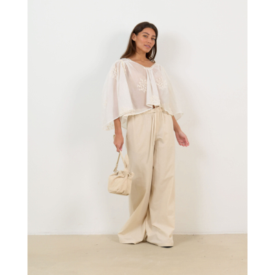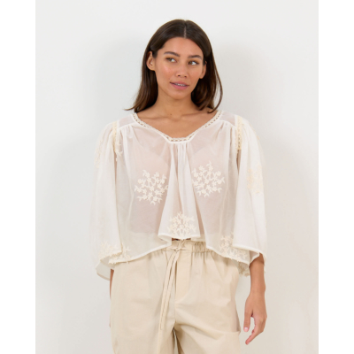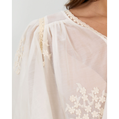Deze romantische babydoll blouse in ecru straalt verfijnde elegantie uit. De luchtige stof van 80% lyocell en 20% polyester zorgt voor optimaal draagcomfort. Opvallende bloemenborduursels versieren de voorzijde, terwijl de driekwart mouwen met elastische manchetten een speelse twist geven. Het kanten detail rond de V-hals en de open rug met strikjes maken deze losvallende blouse tot een statement piece dat zowel modern als tijdloos is.