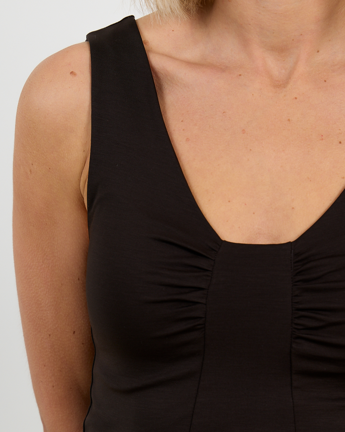 Deze elegante zwarte maxijurk van Drykorn is vervaardigd uit een comfortabele mix van 73% lyocell, 23% polyamide en 4% elastaan. De regular fit silhouet vormt zich mooi naar het lichaam met een flatteuze V-hals en brede schouderbanden. Het zachte materiaal valt soepel en zorgt voor een tijdloze uitstraling die zowel casual als chic gedragen kan worden.