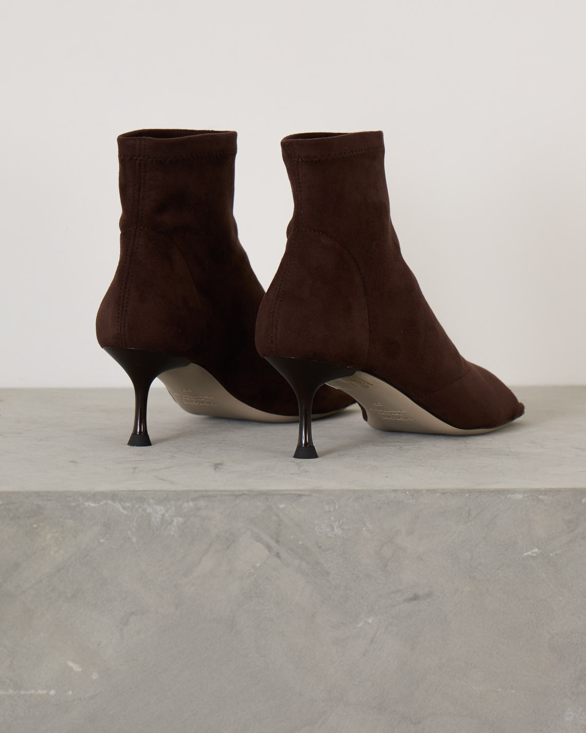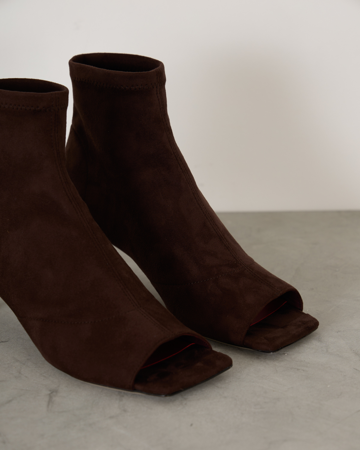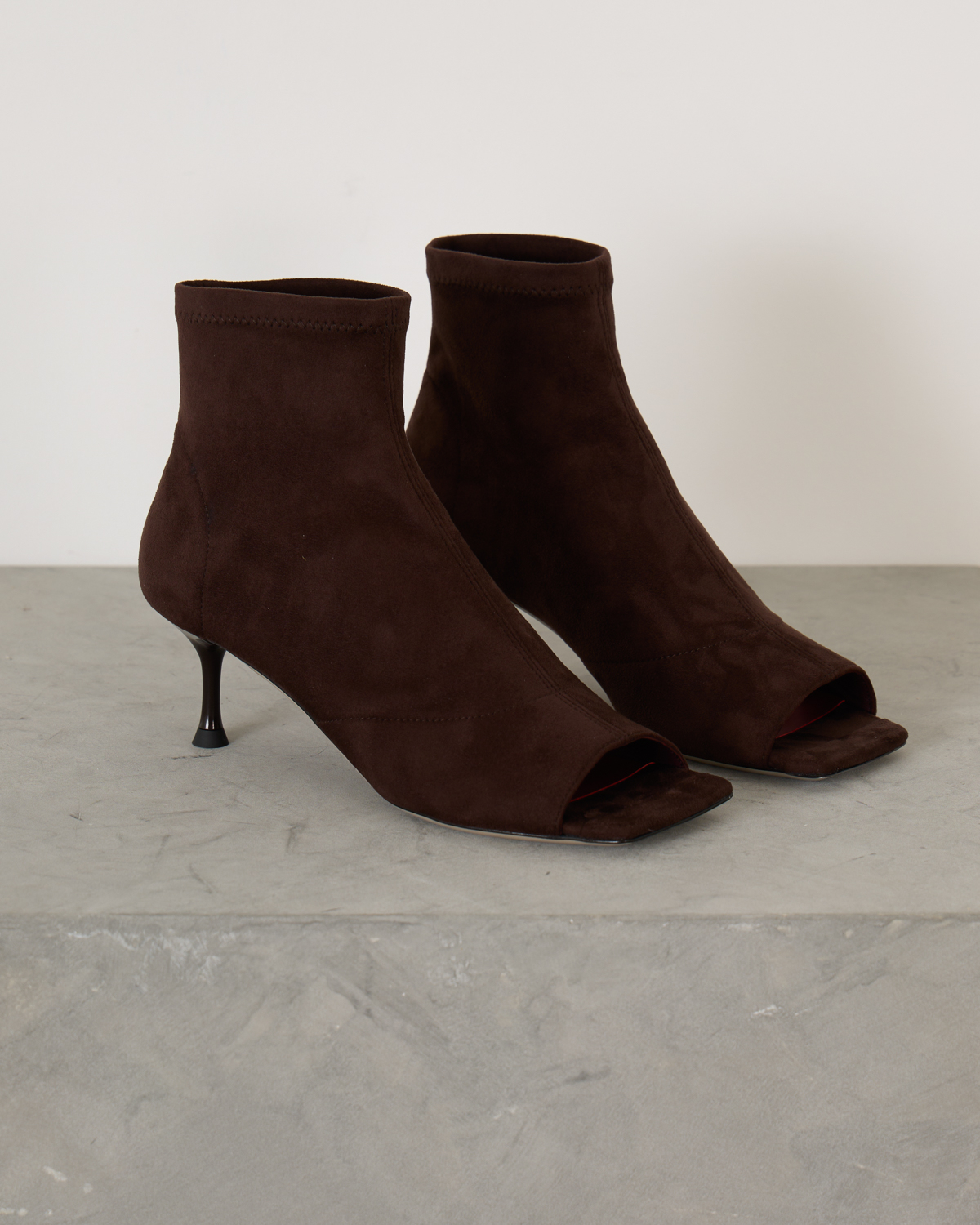 Sock Sandal van het merk Morobé. Het LUZ enkellaarsje is gemaakt van zacht suede leer en uitgevoerd in de kleur chocolat. De schoen is afgewerkt met een vierkante neus en open teen. De hakhoogte is ca. 6 cm