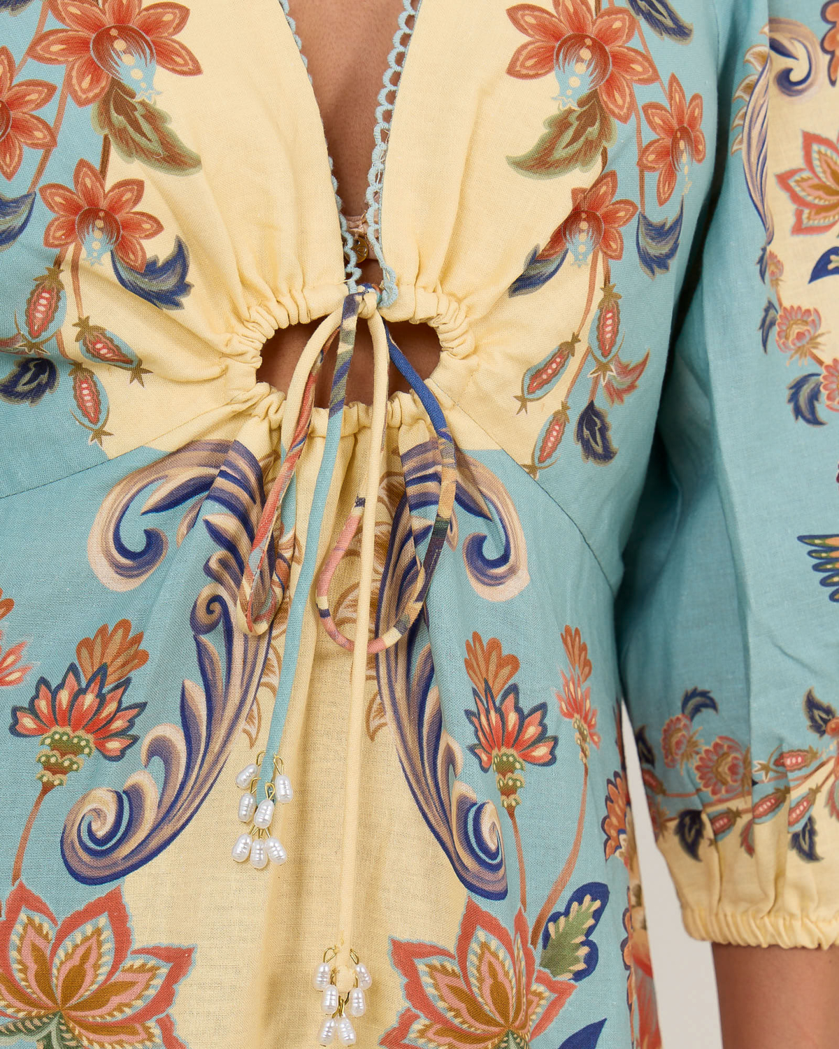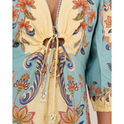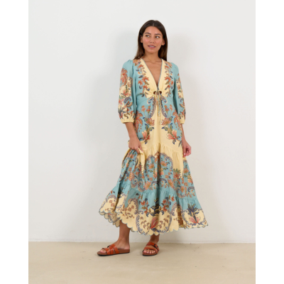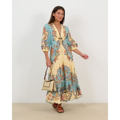Deze midi jurk van Farm Rio valt op door de opvallende blauwe en gele kleurcombinatie met sierlijke barokprints. De V-hals heeft een decoratieve strikdetail met kraaltjes, terwijl de driekwart mouwen zorgen voor een speelse bohemien uitstraling. Het linnen-viscose materiaal (55% linnen, 45% viscose) biedt comfort en ademend draagcomfort. De regular fit heeft gelaagde ruches aan de zoom en een elastische tailleband voor een flatterende pasvorm.