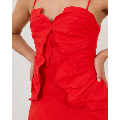 Deze opvallende rode linnen mini jurk van Farm Rio straalt pure elegantie uit. Het natuurlijke linnen zorgt voor optimaal draagcomfort, terwijl de regular fit perfect aansluit. Het strapless bustier met sweetheart halslijn wordt geaccentueerd door verfijnde ruches en een speelse knoopdetail aan de voorkant. De verstelbare bandjes en rits aan de achterzijde zorgen voor een perfecte pasvorm.