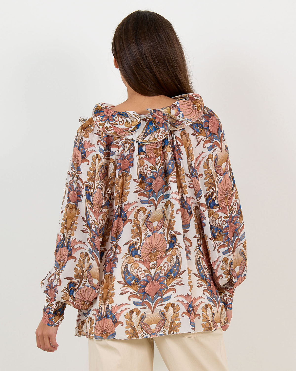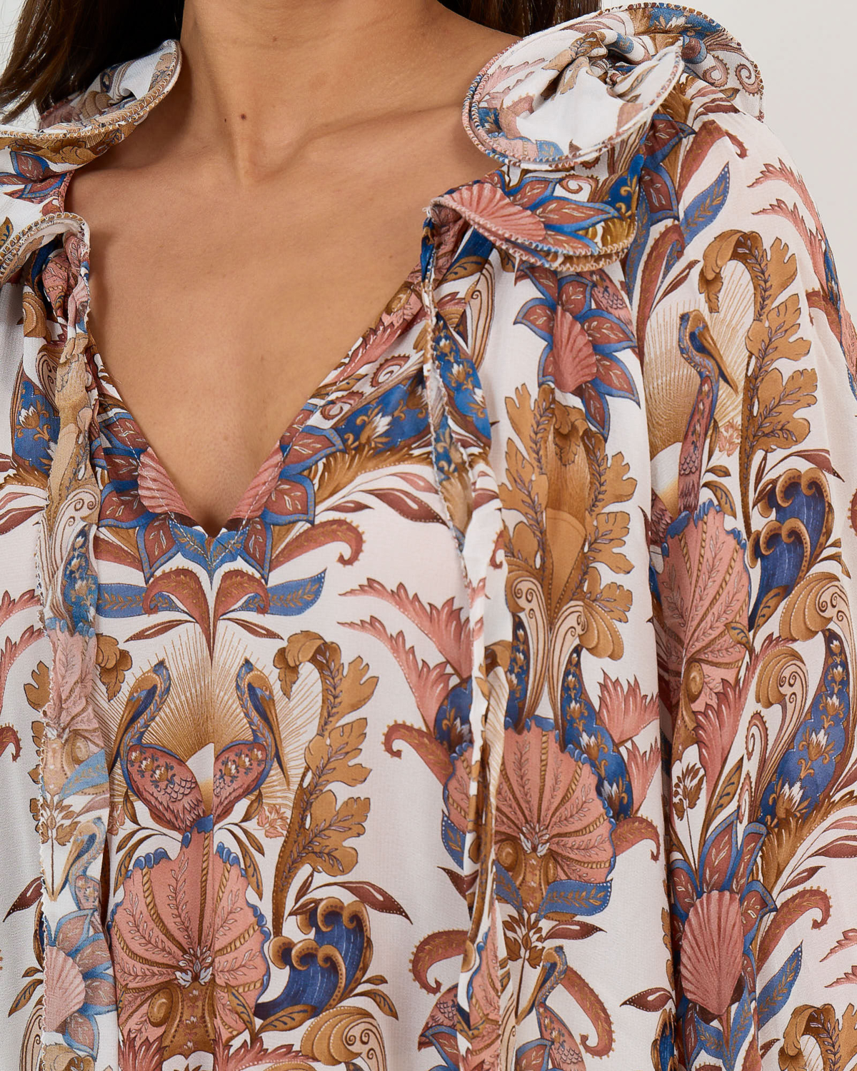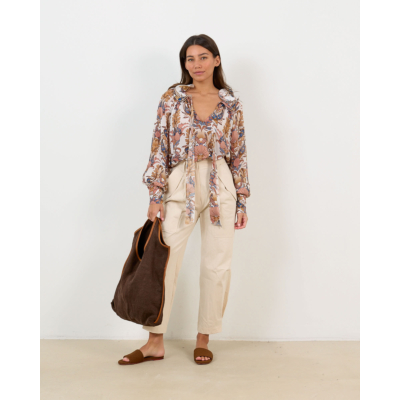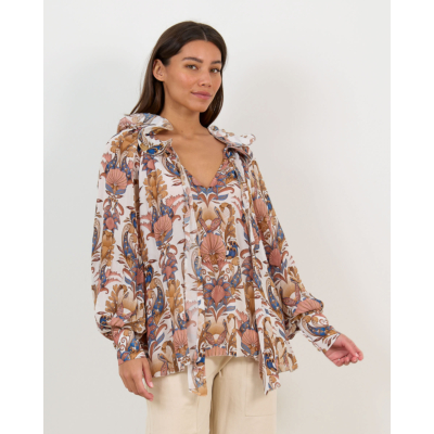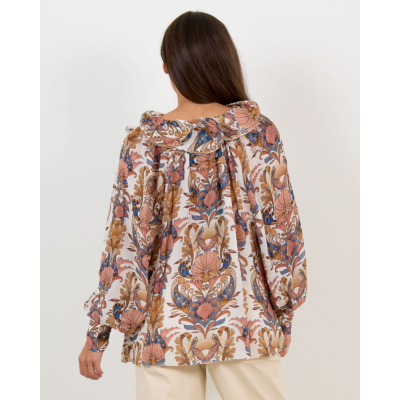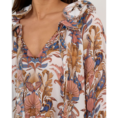 Deze elegante blouse toont een prachtige botanische print met floraal dessin op een zachtcrème achtergrond. De blouse beschikt over een diepe V-hals met ruches details en draagkoordjes voor een verfijnde uitstraling. De volumeuze mouwen zorgen voor een elegante silhouet, terwijl de relaxed fit optimaal draagcomfort biedt. Vervaardigd uit 100% viscose belooft dit ontwerp een aangename draagervaring. De rijke kleurnuances in blauw, roze en okergeel maken dit een opvallend stuk dat stijl en comfort naadloos combineert.