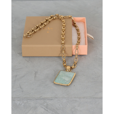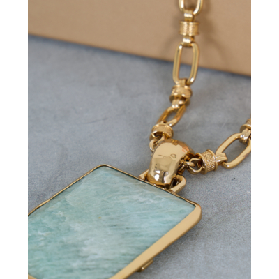 Deze lange ketting met amazoniet steen straalt verfijnde elegantie uit. De gouden brass met fijne goudplating creëert een luxe uitstraling, terwijl de gevarieerde schakelstructuur zorgt voor een moderne twist. Het vierkante amazoniet hangertje in zachte mintgroene tint vormt een prachtig contrast met het warme goud. De gedetailleerde schakels variëren in grootte en textuur, wat deze ketting een uniek en eigentijds karakter geeft.