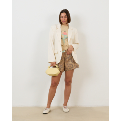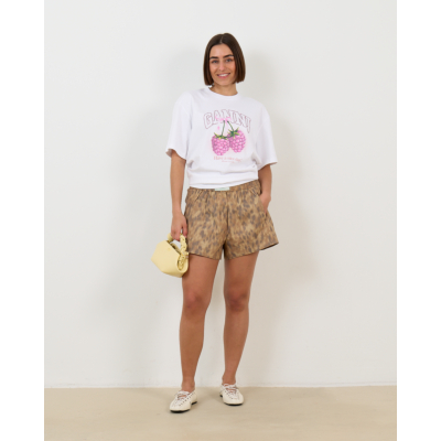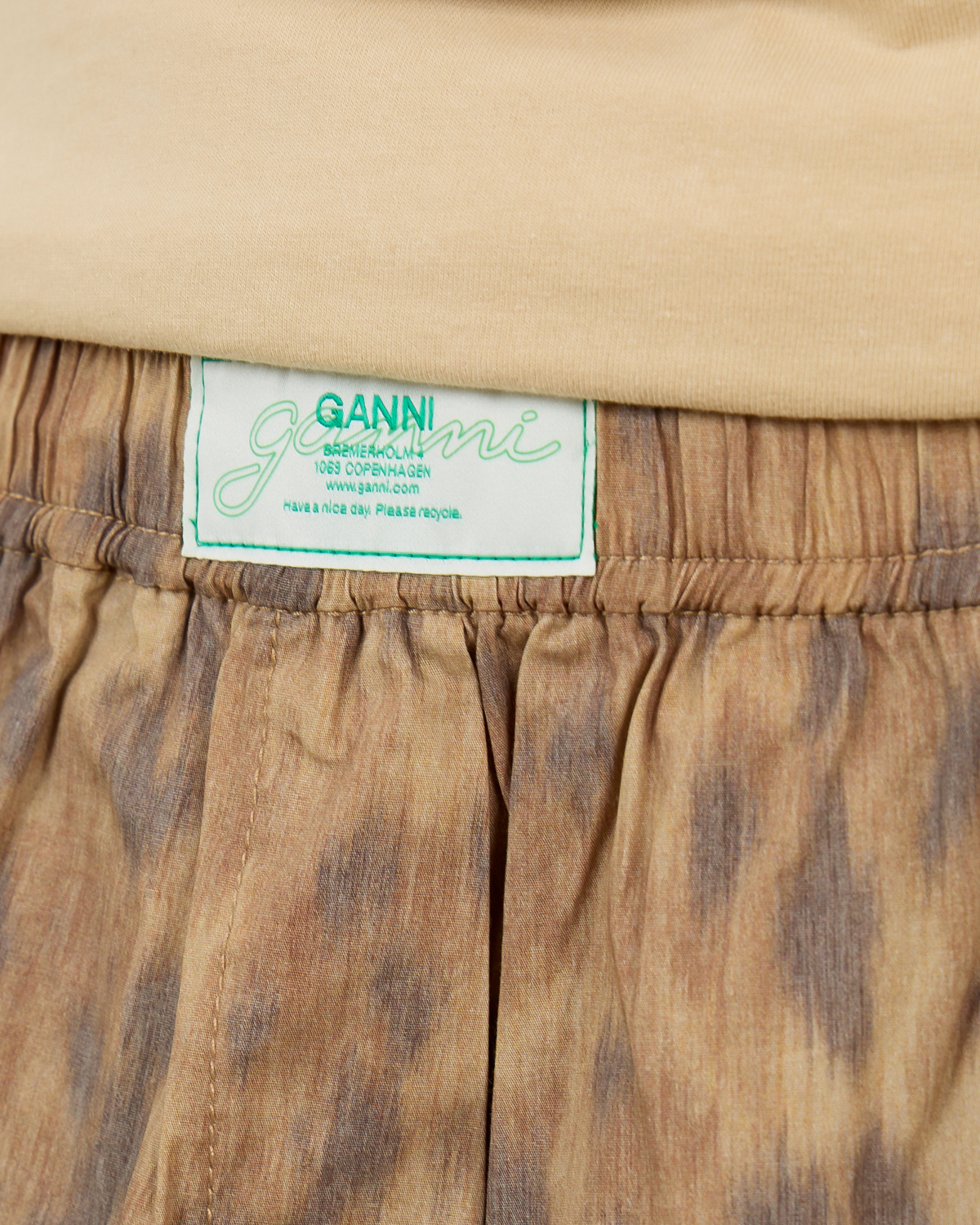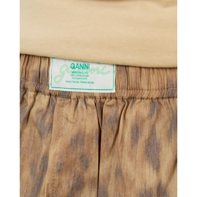 Deze bruine boxer shorts van het Deense merk Ganni combineert comfort met eigentijdse stijl. Het opvallende leopardprint in aardetinten geeft karakter aan je outfit, terwijl de zachte materiaalmix van 67% organisch katoen en 3% elastaan zorgt voor optimaal draagcomfort. De regular fit pasvorm met elastische tailleband biedt bewegingsvrijheid en een comfortabele zit. Praktische steekzakken aan de zijkanten maken deze short compleet.