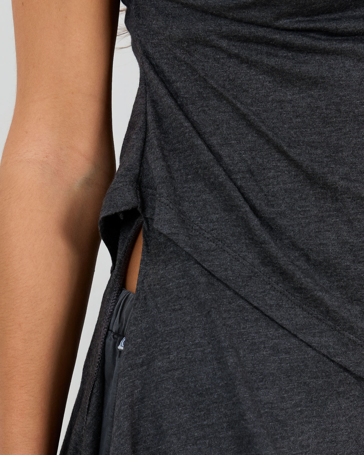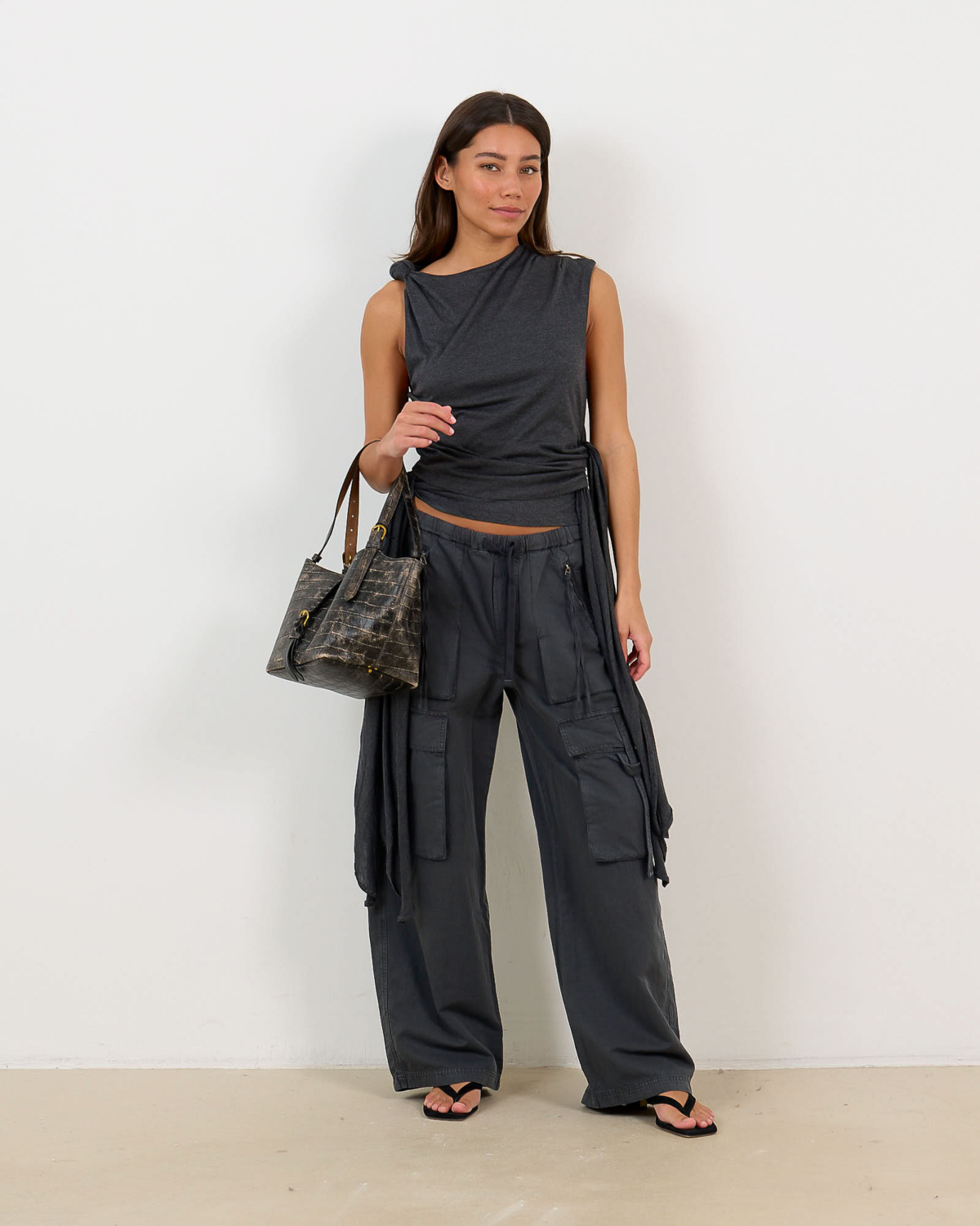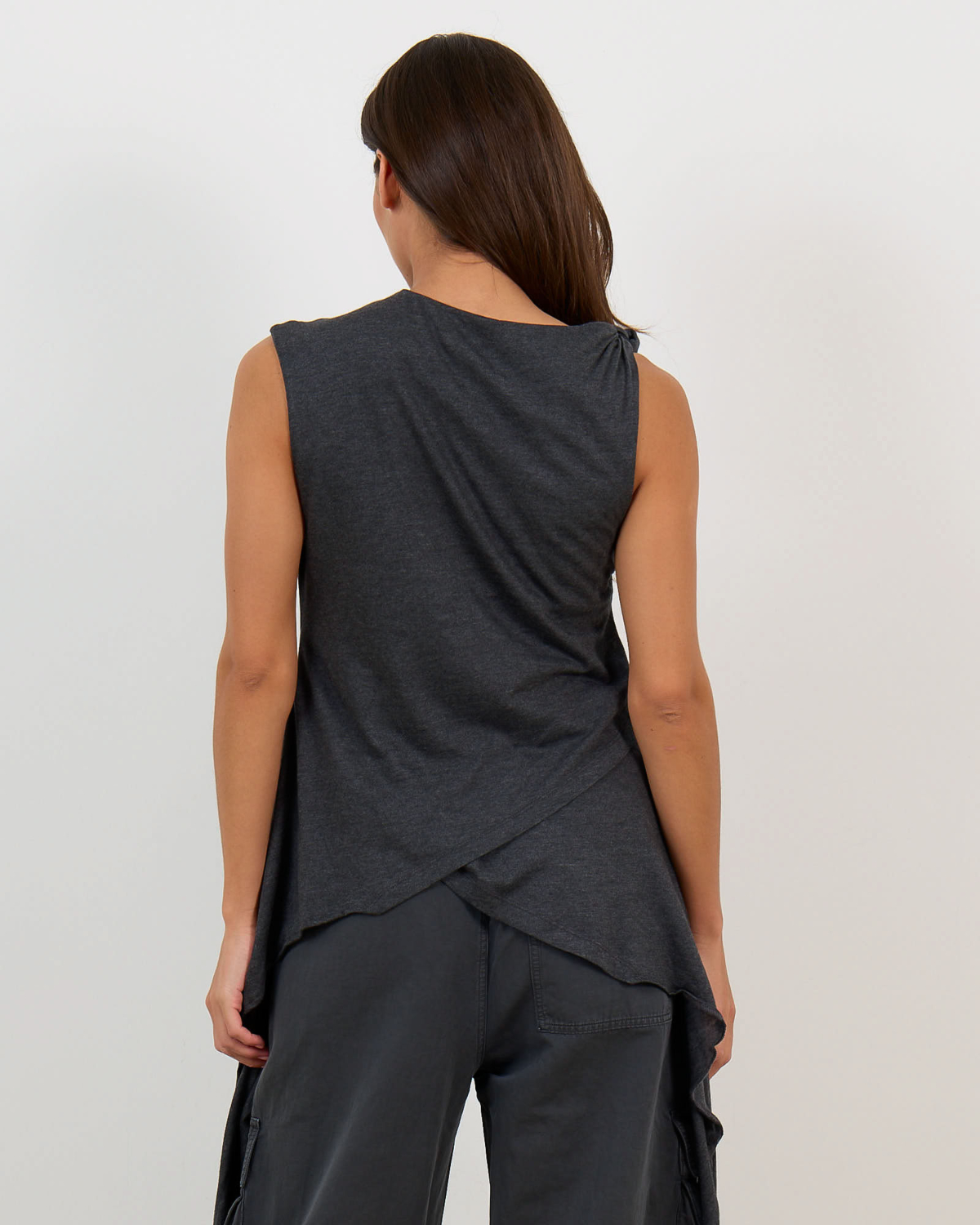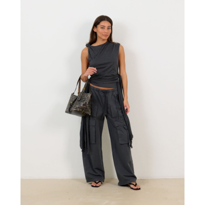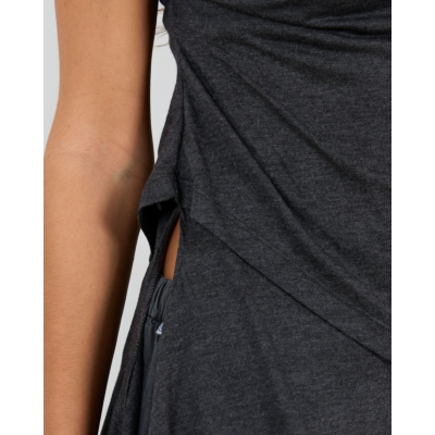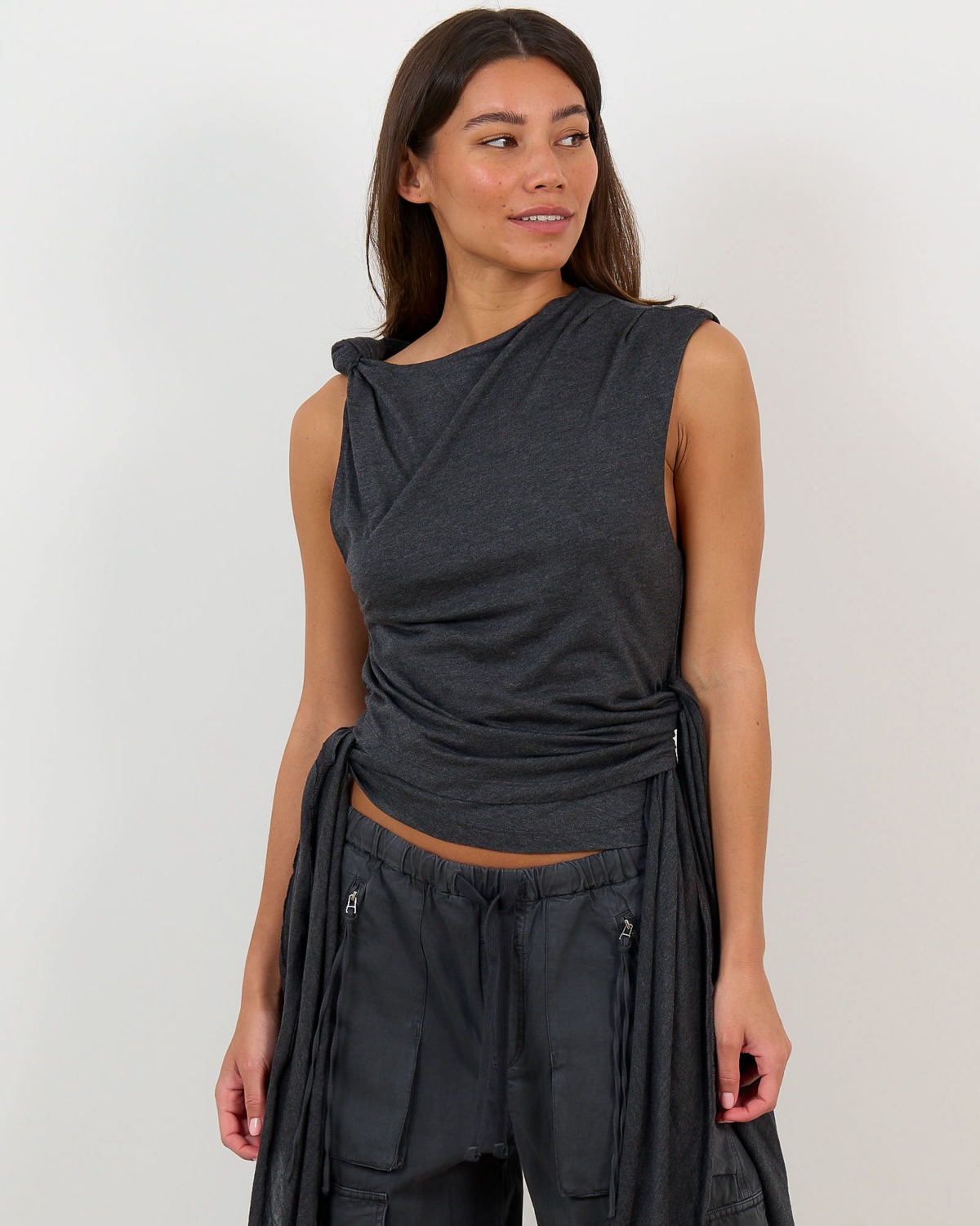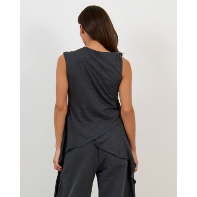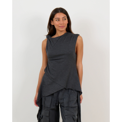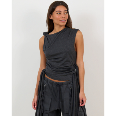 Deze aansluitende top in phantom grijs straalt verfijnde elegantie uit. Het zachte jersey materiaal van 50% organisch katoen en 50% modal biedt optimaal draagcomfort. De top kenmerkt zich door speelse knoopdetails bij de schouders en een opvallende wikkelstijl aan de zijkant met strikkoord. De mouwloze snit geeft een moderne twist aan de klassieke jersey stijl.