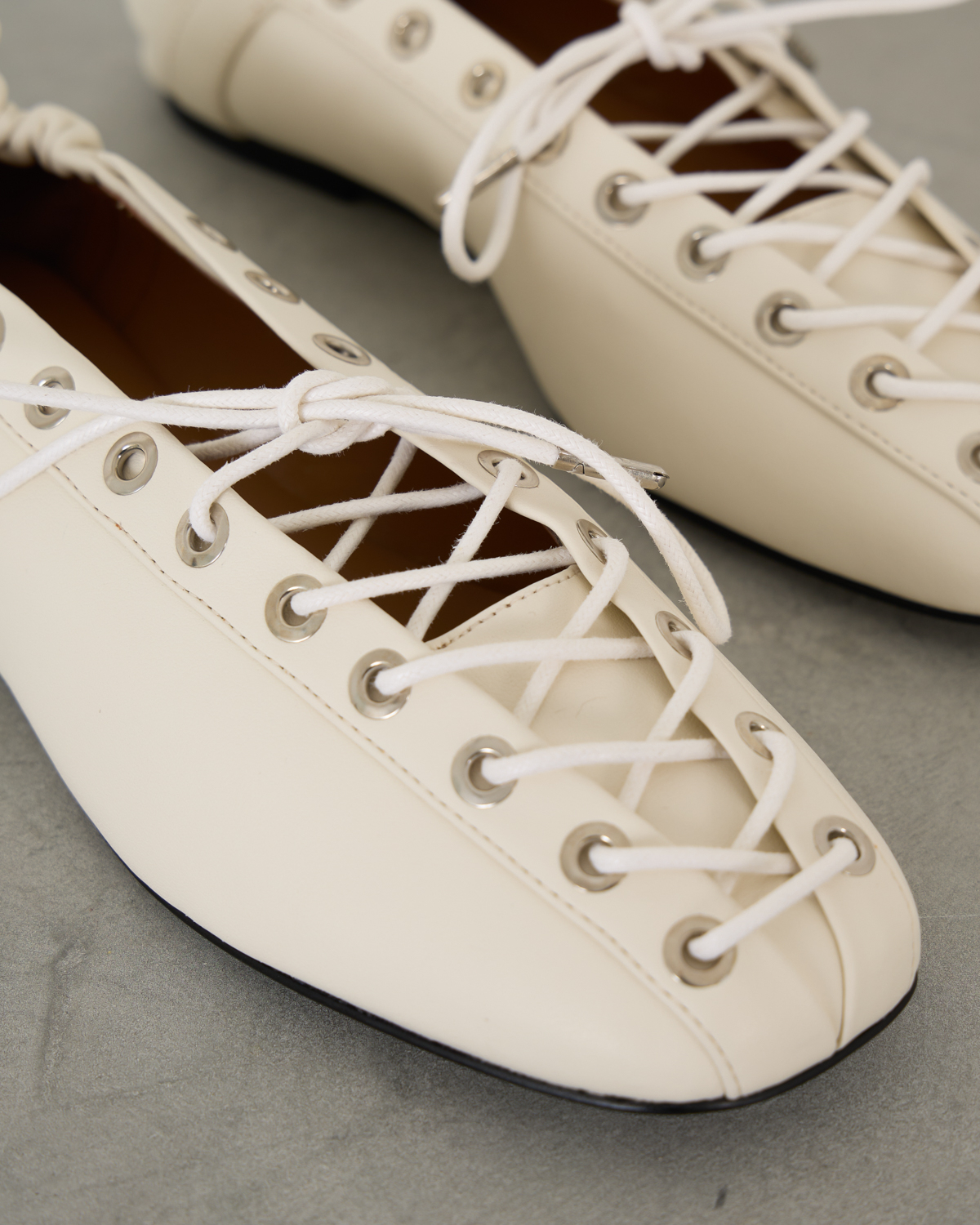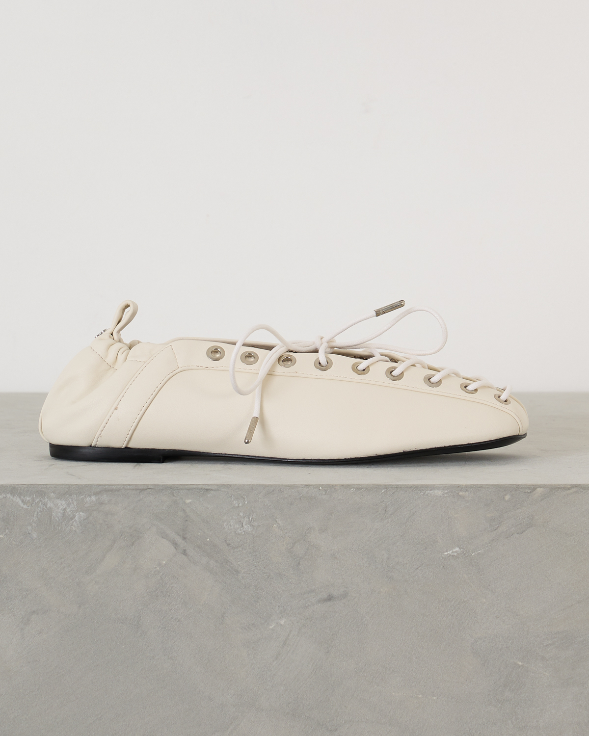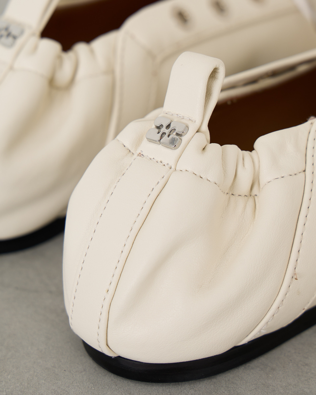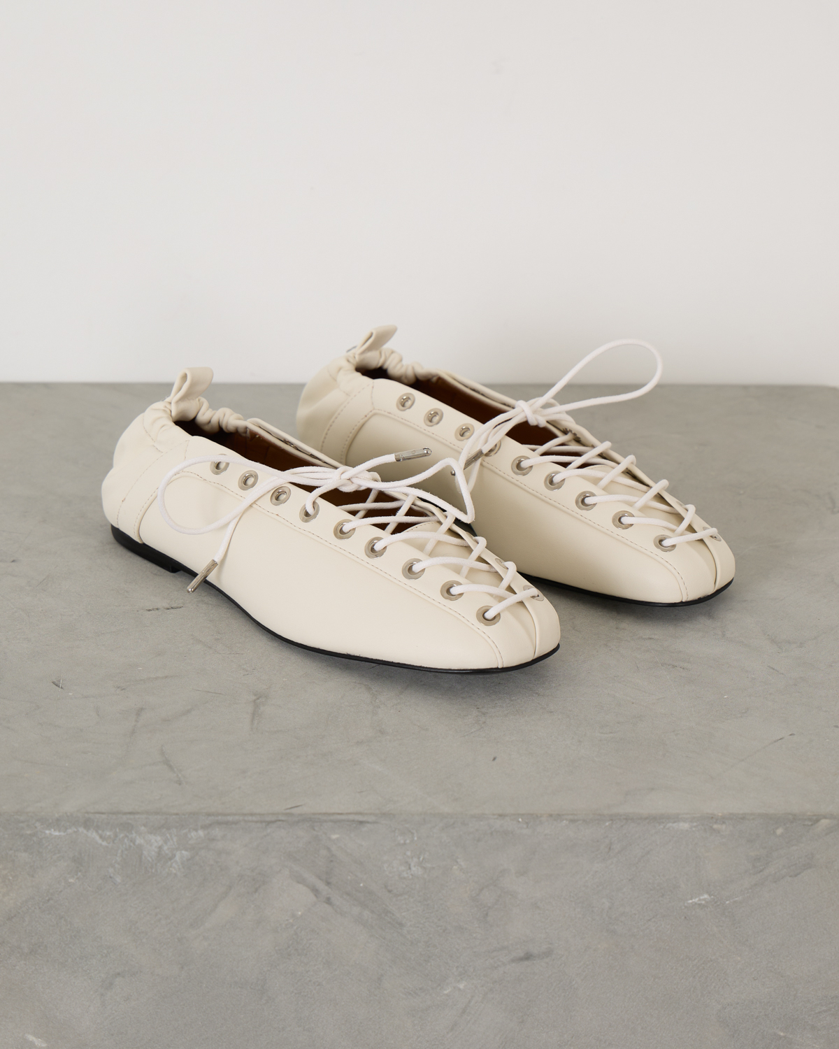 De Oleatex Lace-Up Ballerinas van GANNI zijn een moderne interpretatie van de klassieke ballerina, geïnspireerd op veterlaarzen uit de jaren 1920. Deze schoenen zijn vervaardigd uit een innovatieve crinkle Oleatex-mix, een duurzaam alternatief voor leer, en maken deel uit van GANNI's "Fabrics of the Future"-lijn. Het ontwerp wordt gekenmerkt door metalen oogjes en gekruiste, gewaxte veters die aan de voorkant gestrikt worden, wat zorgt voor een eigentijdse en verfijnde uitstraling.