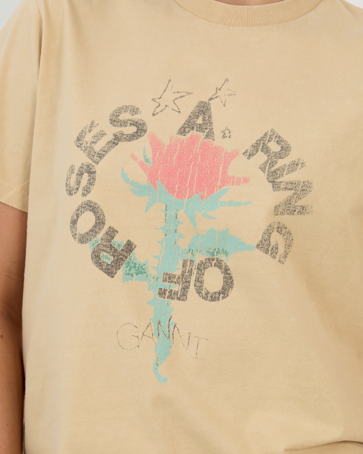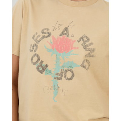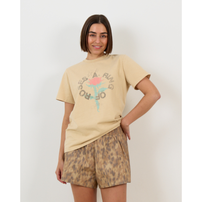 Dit gele shirt toont een opvallende rozenprint met de tekst "Safari" in cirkeldesign op de voorzijde. De korte mouwen en ronde hals zorgen voor een klassieke T-shirt snit, terwijl de regular fit comfortabel draagt. Vervaardigd uit 50% organisch katoen en 50% gerecycled katoen biedt het een aangename textuur. De warme gele kleursamenstelling vormt een zelfverzekerde basis voor verschillende stylecombinaties.