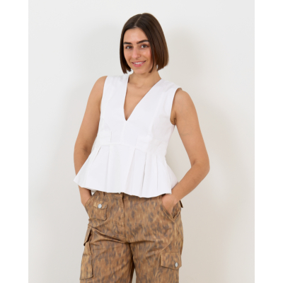 Deze elegante witte peplum top valt op door de diep ingesneden V-hals en het vrouwelijke peplum silhouet dat vanaf de taille uitwaait. Het mouwloze design combineert perfect met de zachte organische katoen samenstelling (97% organisch katoen, 3% elastaan) voor optimaal draagcomfort. De ritssluiting aan de achterkant zorgt voor een strakke pasvorm in Regular Fit.