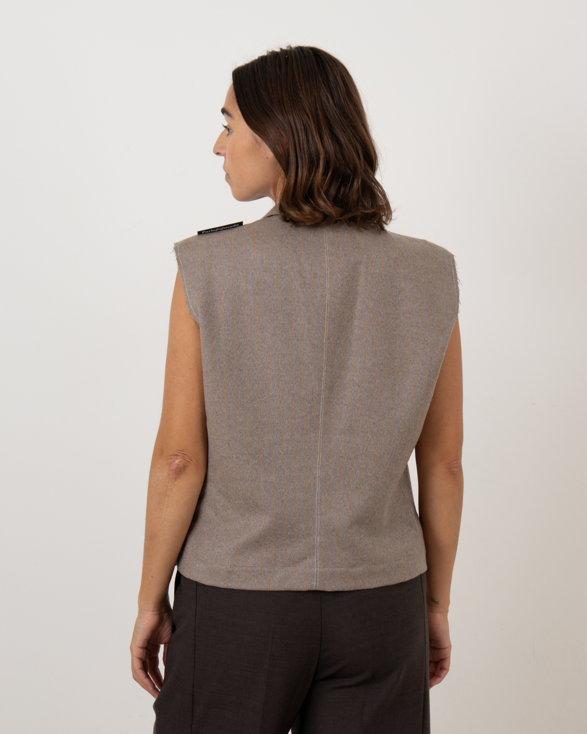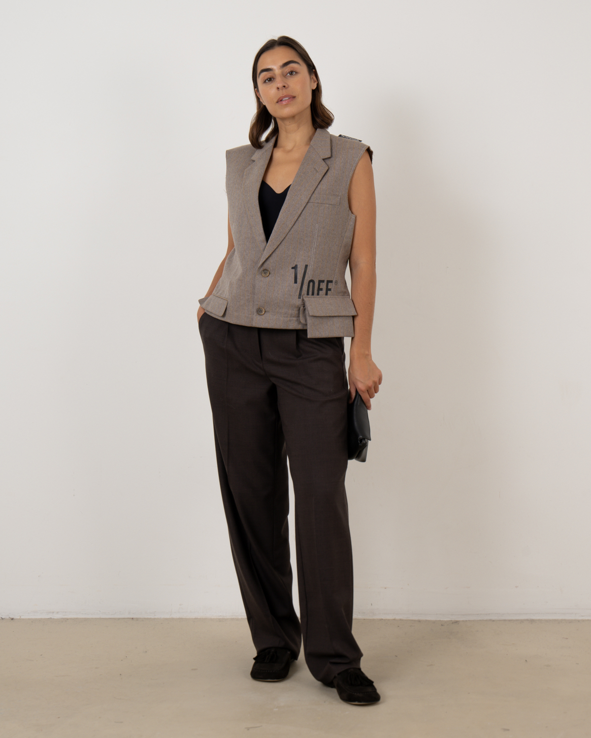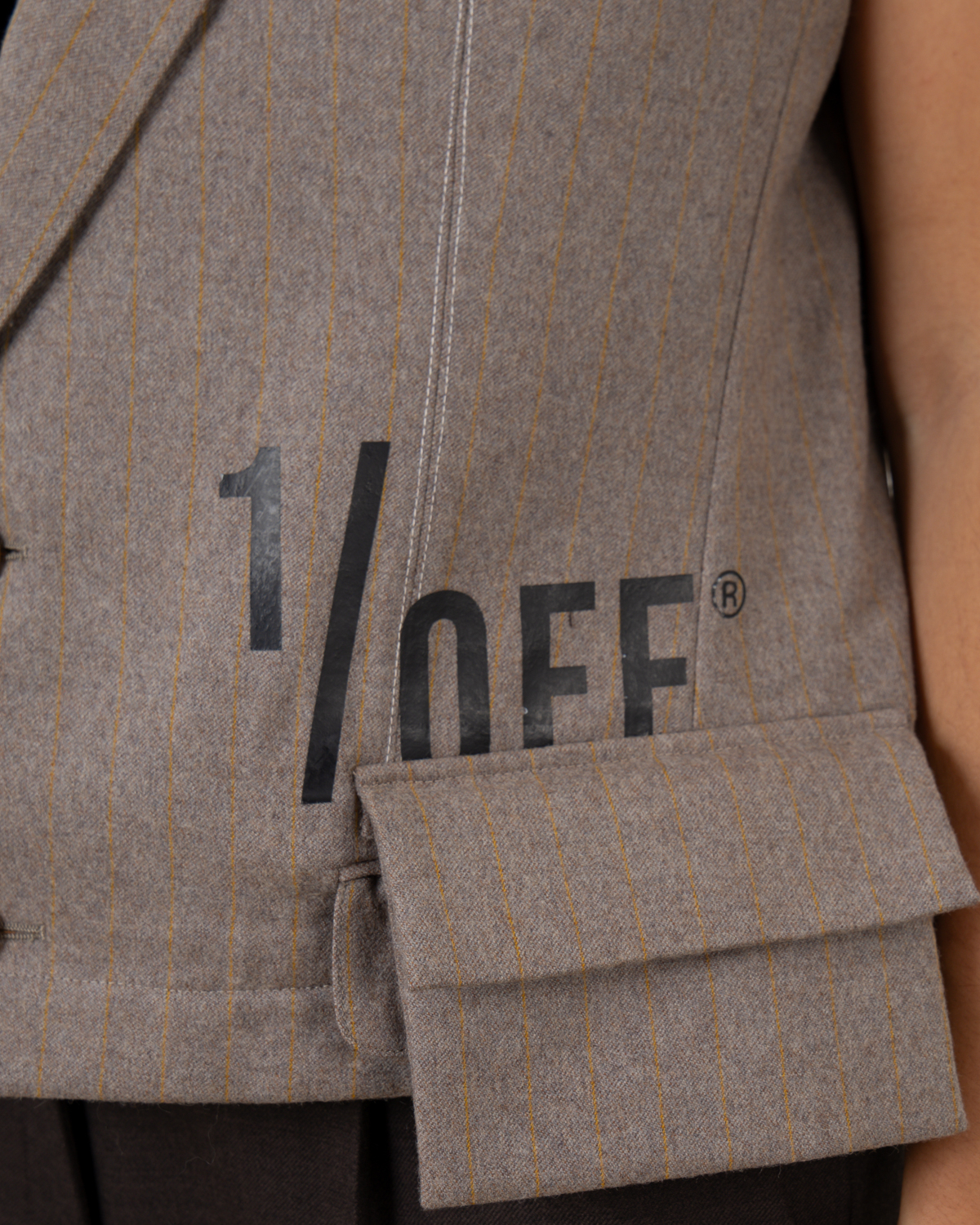 Dit grijze gilet straalt moderne elegantie uit met zijn korte, getailleerde snit. De klassieke blazerdetails zoals het gestructureerde revers en dubbele knoopsluiting zorgen voor een verfijnde uitstraling. Het mouweloze ontwerp met opvallende schoudervulling creëert een krachtige silhouet. De 80% polyester en 20% katoen samenstelling biedt comfort en vormvastheid. Het subtiele streepdessin en het opvallende 1/OFF logo aan de onderzijde maken dit gilet een statement piece.