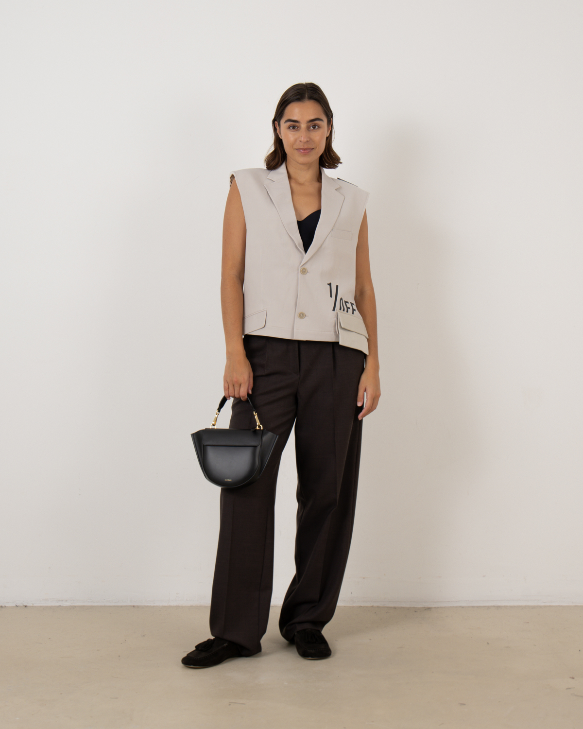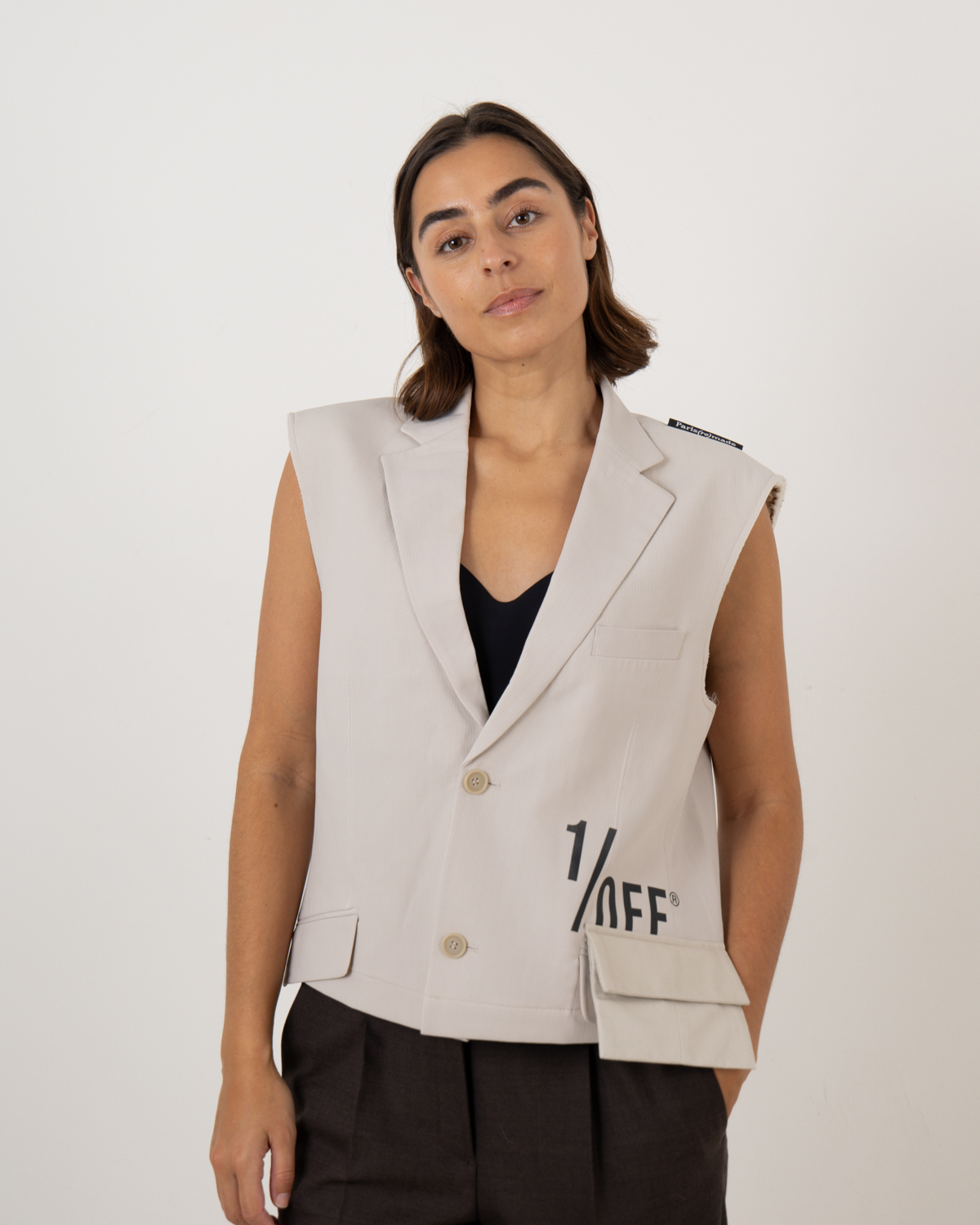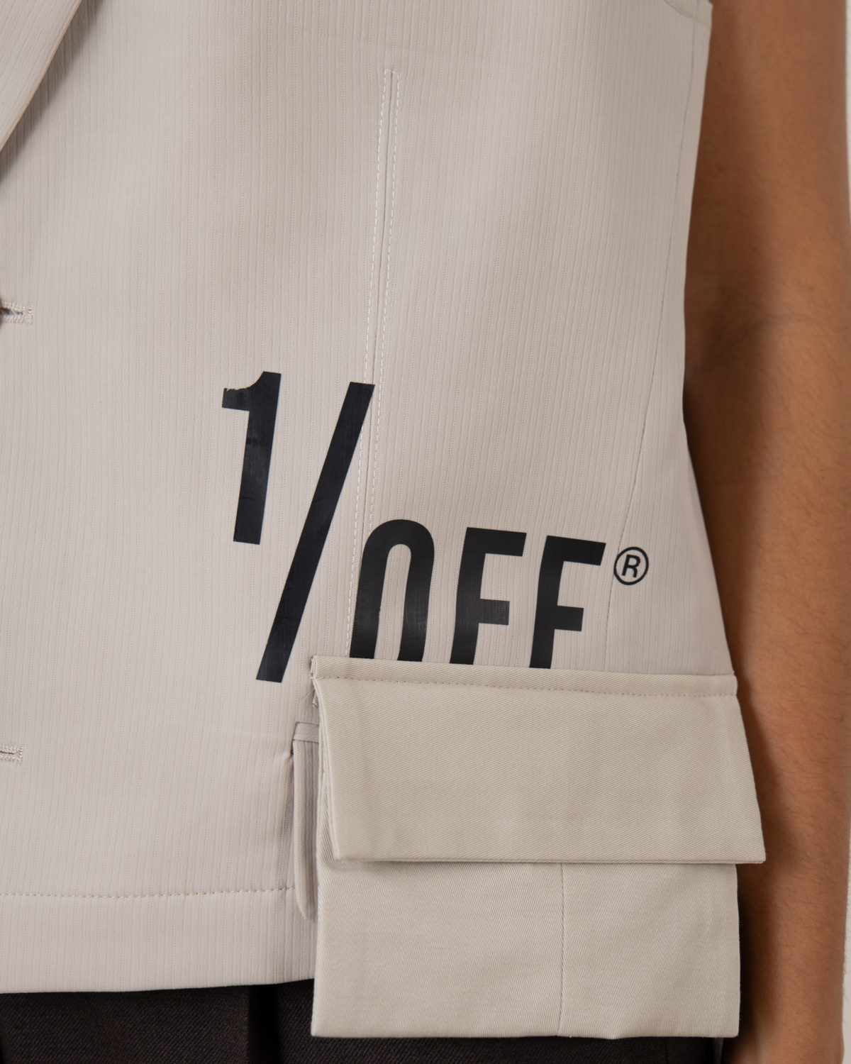 Dit beige gilet combineert tailoring met hedendaagse details. Het mouwloze ontwerp heeft een klassiek revers en knoop je met twee knoopsluiting. Het opvallende 1/OFF logo op de voorkant zorgt voor een moderne twist, terwijl de praktische zakken aan de voorzijde functionaliteit toevoegen. De regular fit pasvorm zorgt voor een comfortabele dracht. Een eigentijdse interpretatie van klassieke gilet stijlen die past in je moderne garderobe.