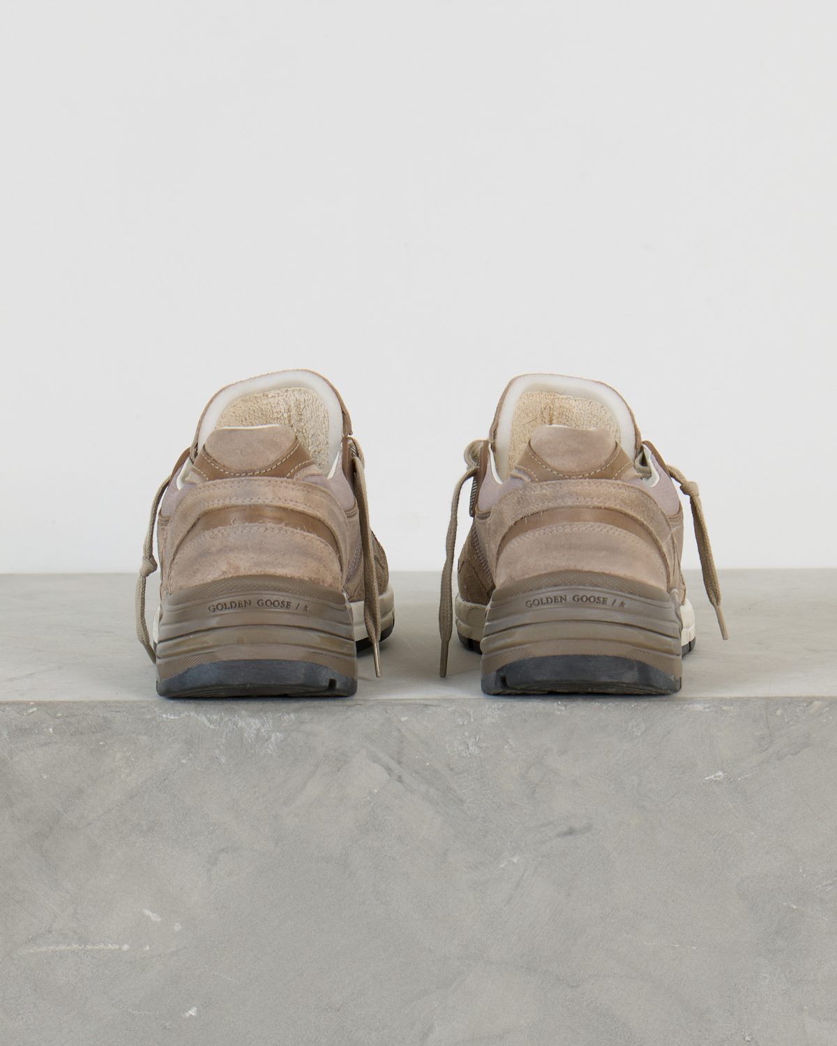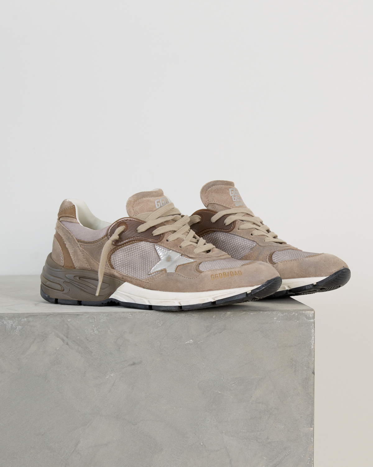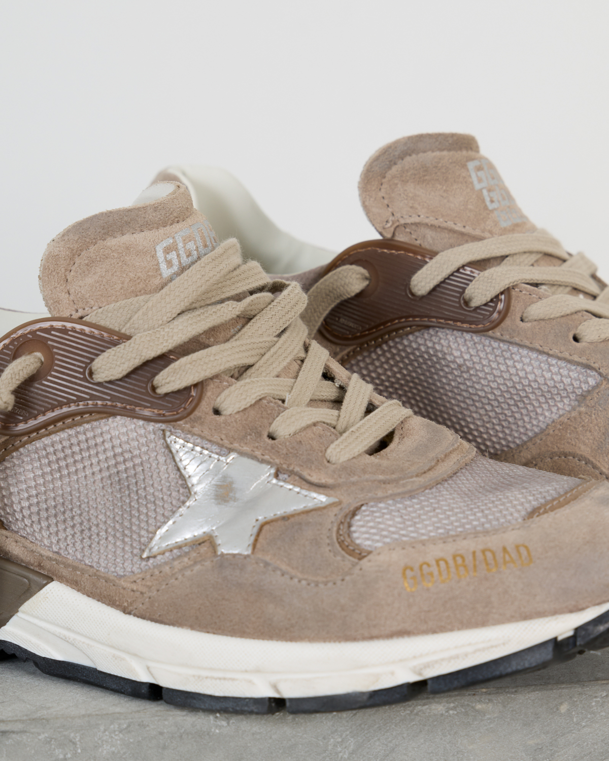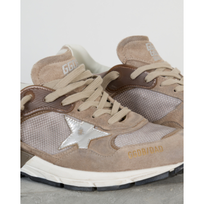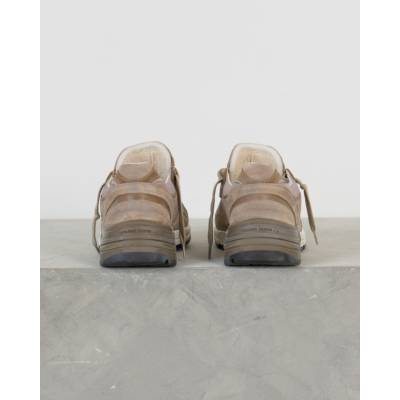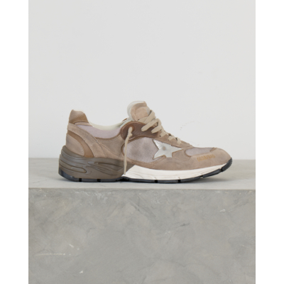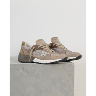 Deze beige dad sneakers van Golden Goose combineert verfijnd suède met ademend mesh voor optimaal comfort. Het leer-mesh materiaal zorgt voor een luxueuze uitstraling, terwijl de kenmerkende zilveren ster het ontwerp voltooit. De dikke, geprofileerde zool biedt uitstekende demping en de beige veters completeren de eigentijdse dad sneaker stijl.