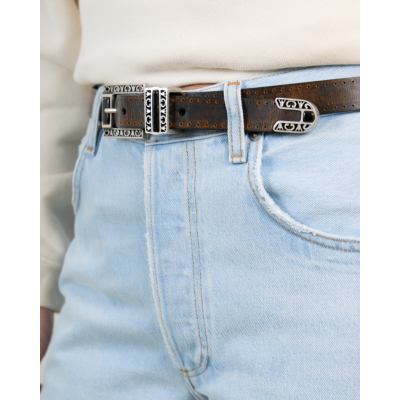 Deze bruine leren ceintuur straalt Italiaanse vakmanschap uit met haar rijk geperforeerde patroon en kenmerkende zilveren hardware. Het gedetailleerde leerwerk combineert perfecte afwerking met opvallende designelementen. De geornamenteerde gesp en unieke veiligheidsspeld-vormige ring geven dit accessoire een luxueuze uitstraling die direct opvalt.