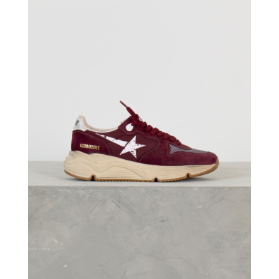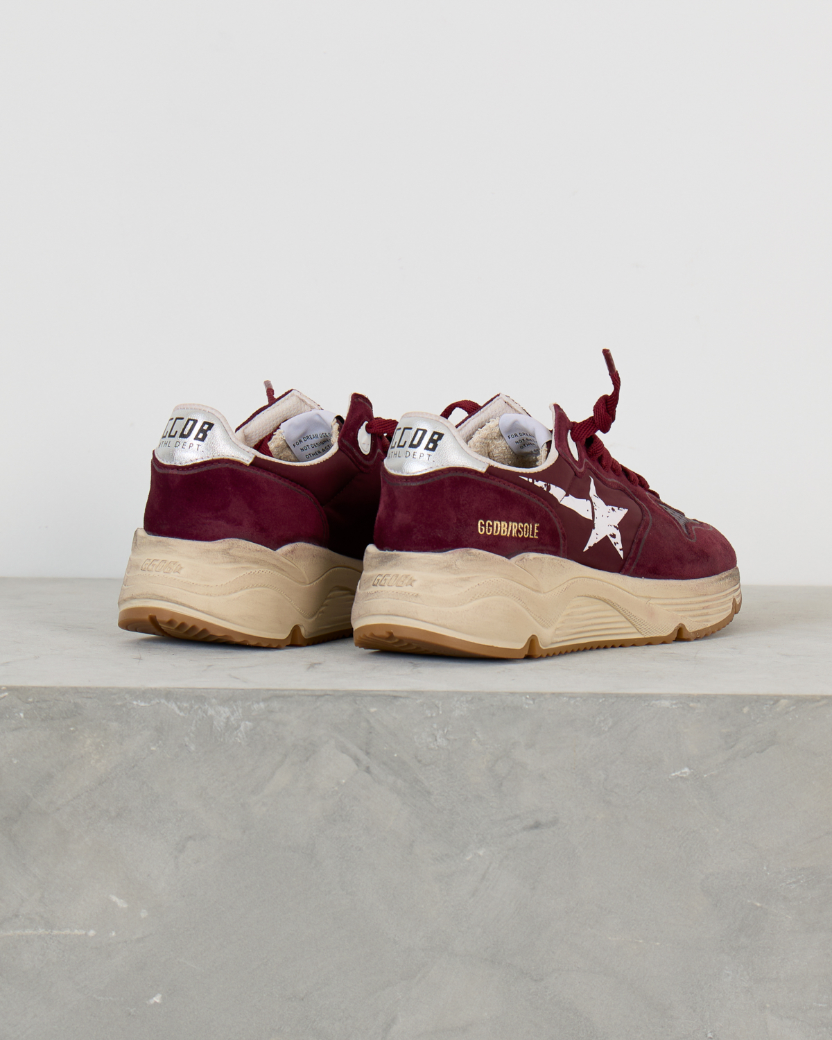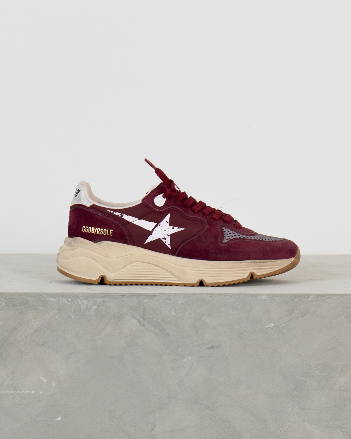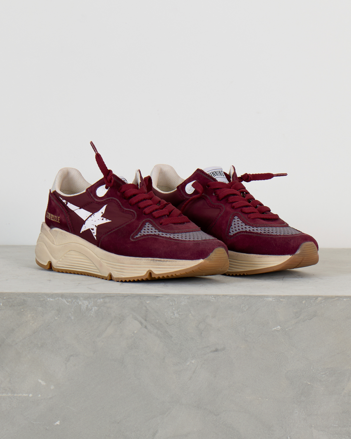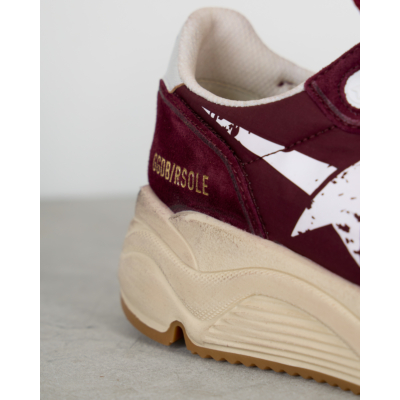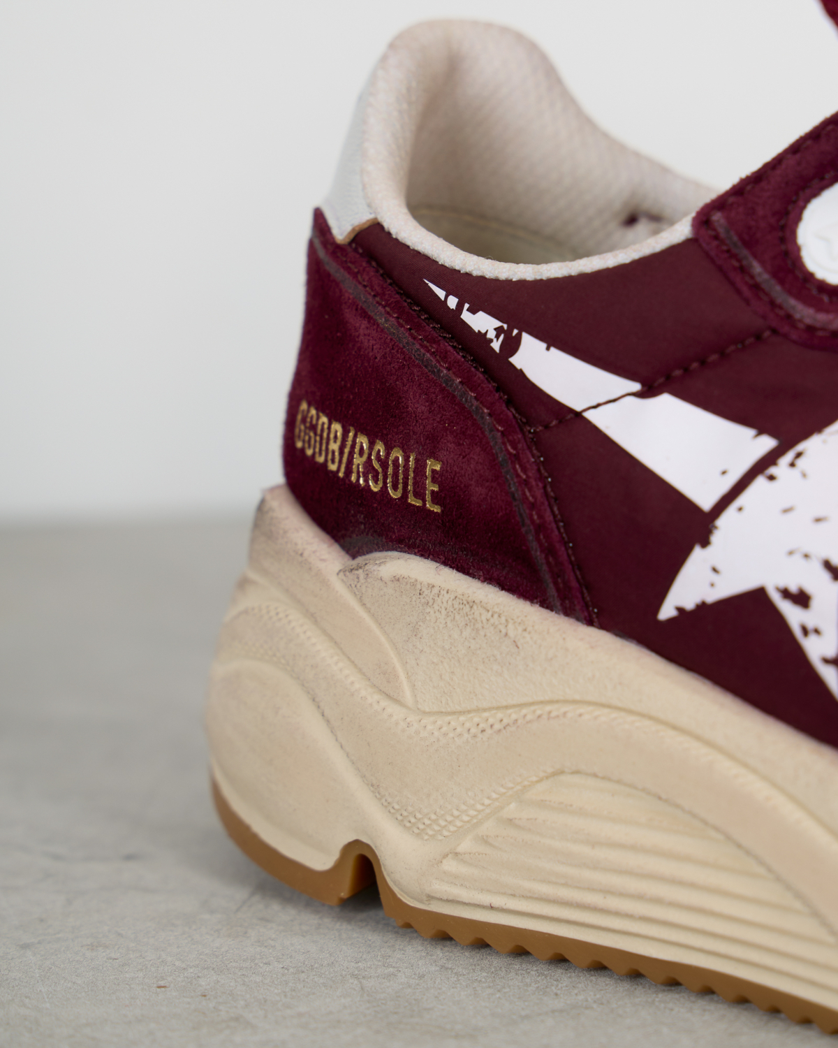 Deze stijlvolle running sneakers straalt eigentijdse elegantie uit. De diepe bordeauxrode kleur van de nylon en suède bovenkant vormt een prachtig contrast met de iconische witte ster en crèmekleurige tussenzool. Het GGDB/RSOLE logo op de achterkant benadrukt het authentieke karakter van dit design. De geperforeerde mesh details zorgen voor ademend draagcomfort, terwijl de verhoogde chunky zool een moderne, sportieve uitstraling creëert.