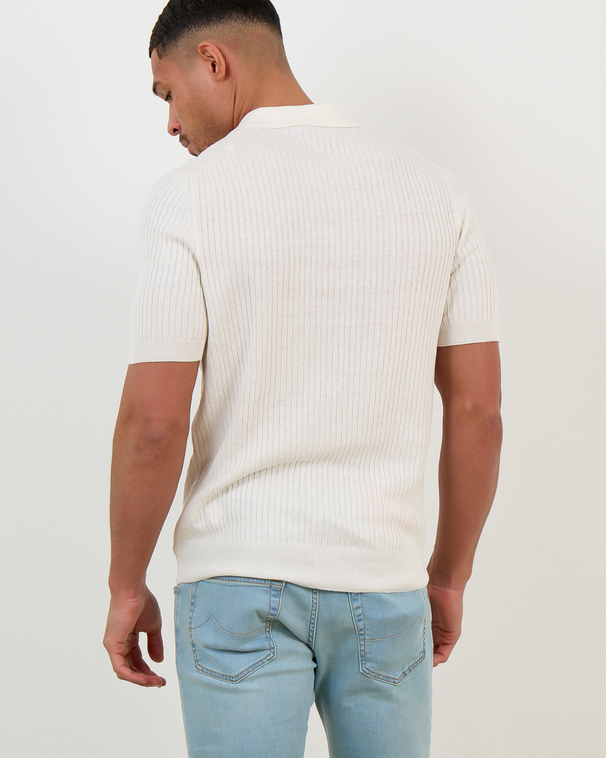 Deze off white poloshirt van Gran Sasso combineert verfijnd materiaal met eigentijds design. Het linnen-katoen mengsel (68% linnen, 32% katoen) zorgt voor natuurlijke ademing en comfort. De relaxed-fit pasvorm biedt bewegingsvrijheid, terwijl de ribstructuur door het hele shirt een subtiele textuur creëert. De klassieke polokraag en knoopsluiting met drie knopen geven een tijdloze uitstraling.