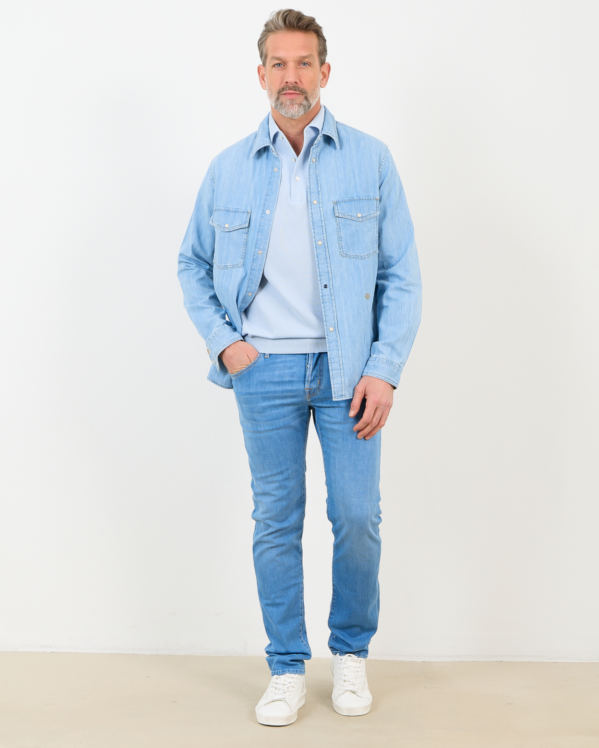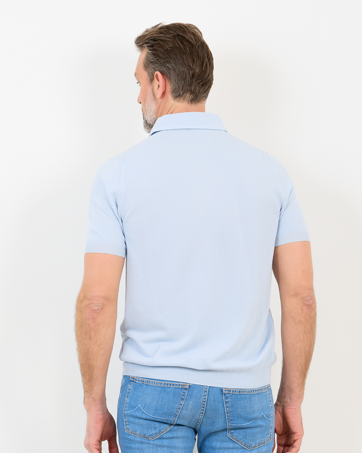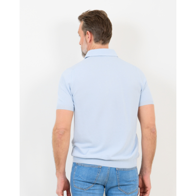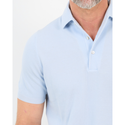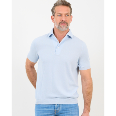 Deze lichtblauwe herenpolo van Gran Sasso onderscheidt zich door de verfijnde gebreide structuur van 100% katoen. De korte mouwen en klassieke polokraag geven een tijdloze uitstraling, terwijl de witte knoopjes een stijlvolle finishing touch toevoegen. De fijne katoenen kwaliteit zorgt voor optimaal draagcomfort en ademend vermogen. Perfect te combineren met een casual chino voor een relaxte look, of onder een blazer voor een elegantere stijl.