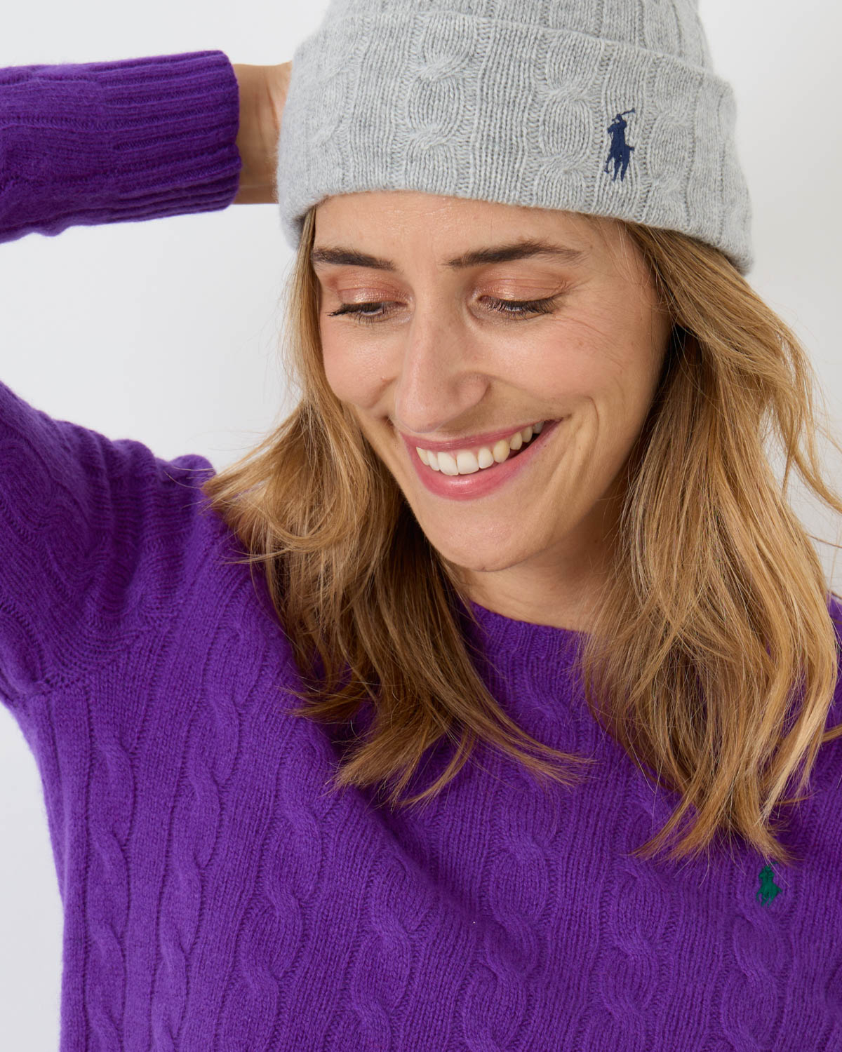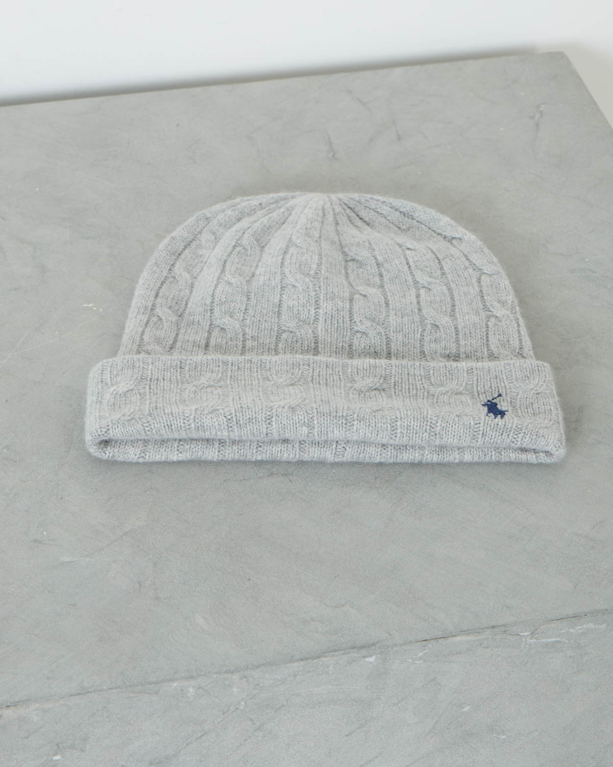 Beanie van het merk Ralp Lauren in de kleur soft grey. Deze Beanie is gemaakt van een wol cashmere mix en heeft het bekende polo paard op de voorkant geborduurd in het blauw.